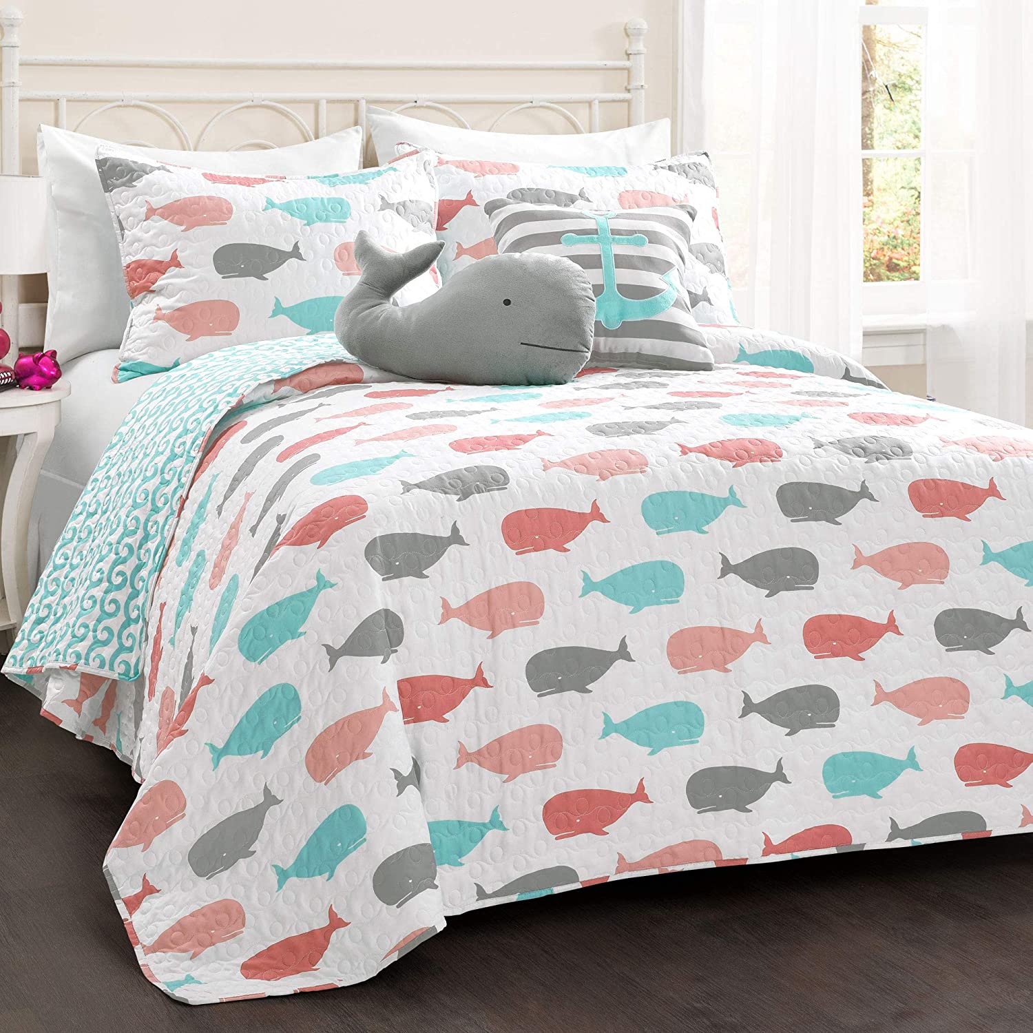 Lush Decor Whale Kids Reversible 4 Piece Quilt Bedding Set with Sham and Decorative Throw Pillows, Twin, Pink and Aqua