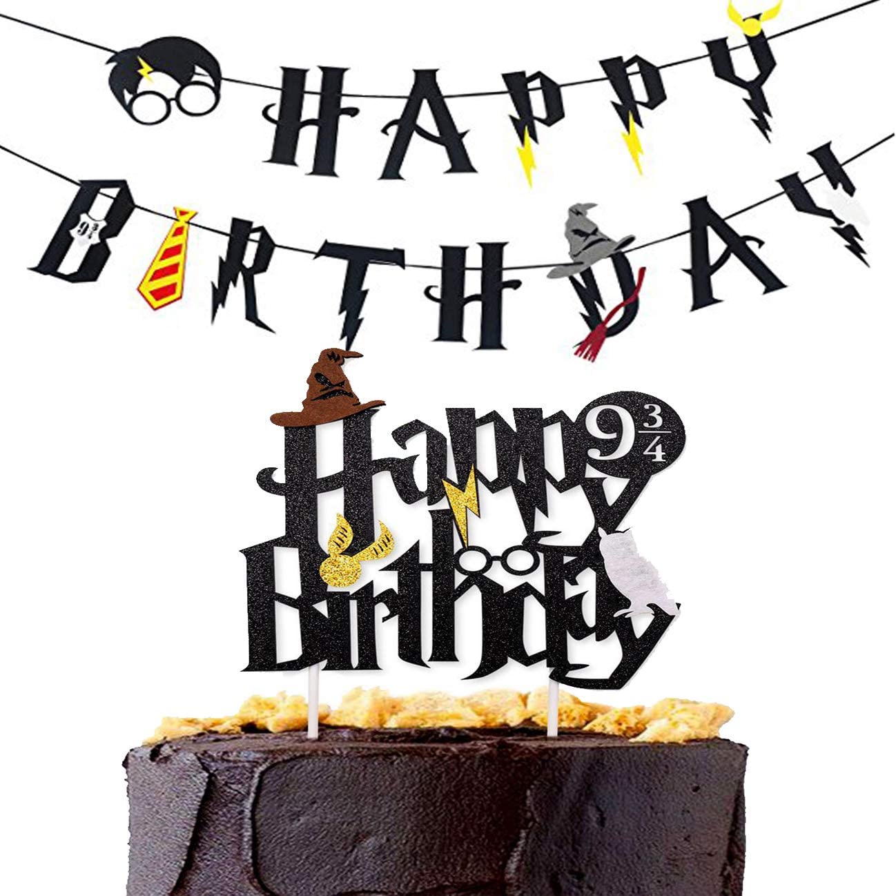 Magic Party Banner, 2pcs Happy Birthday Banner with Cake Topper Garland Party Decoration Wizard Party Supplies Potter Themed Party