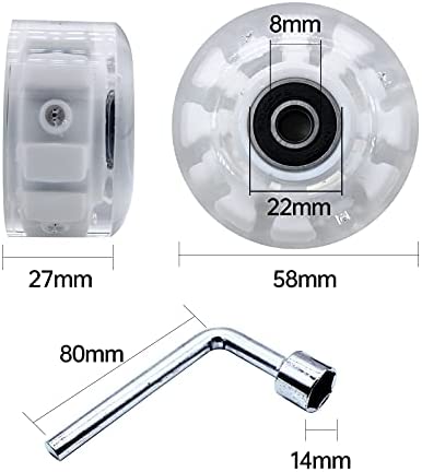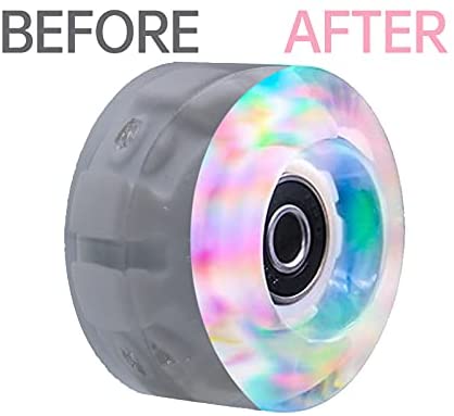 Magicorange 4 pack Luminous Light Up Quad Roller Skate Wheels Specifications: Material:Polyurethane polymer synthetic material Bearing:high speed 608RS Kernel:LED light Size:32mm x 58mm Whether to shine:YES Hardness:82A Resilience:80% Quantity:4 PACK Application:Double roller skating, skateboard Luminous color: Colorful Package Included: 4 x Roller Skate Wheels (Installed 608 Bearing and core) 1 x special wrench for roller skating wheels Note 1. Due to the difference of light and screen, the color of the product may differ from the picture. 2. Manual measurement, please allow 0.5-2 cm error. 3. If the wheels dont light up, the bearing may be loose, please press the bearing with your hand and the wheel will light up.