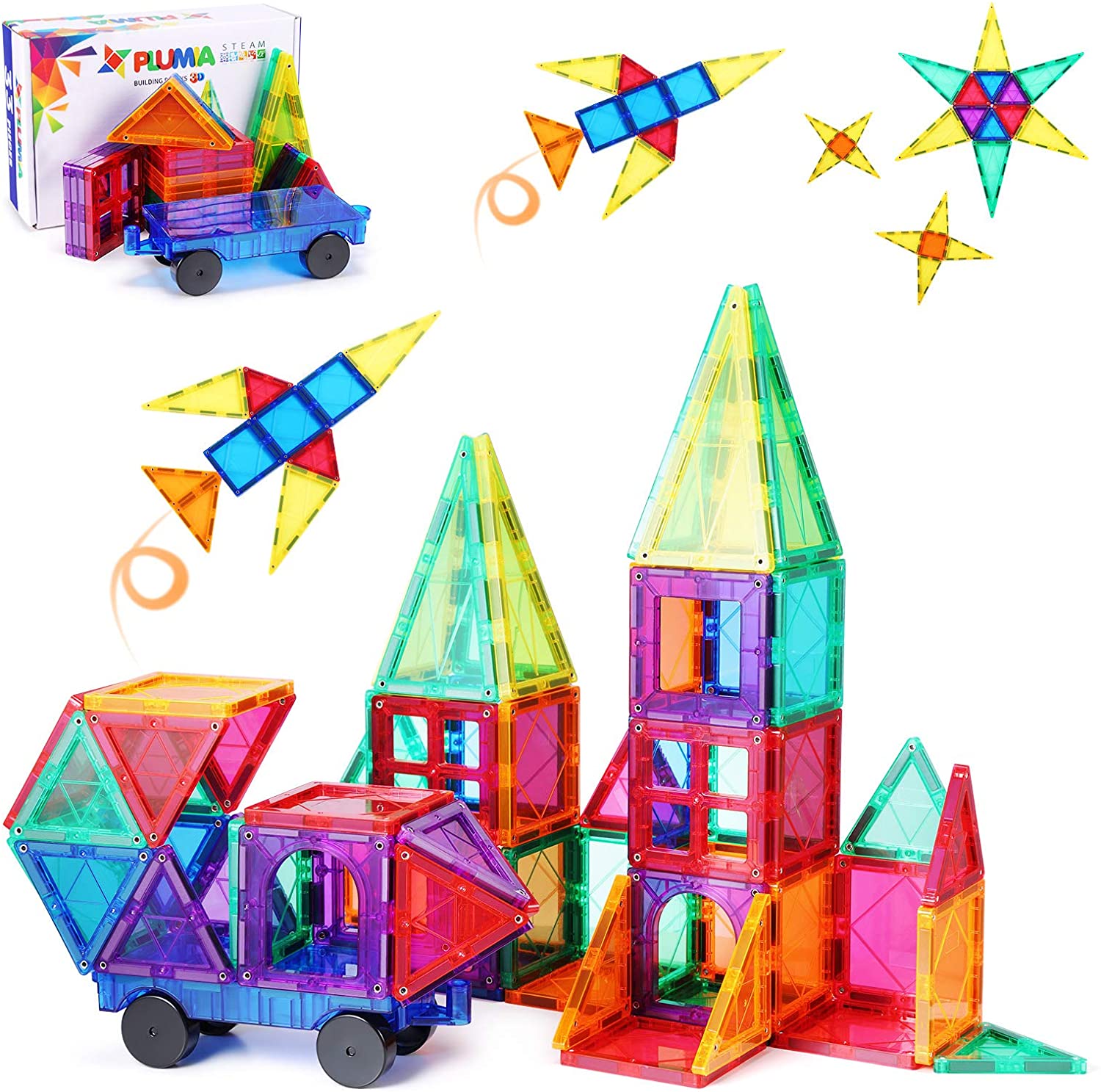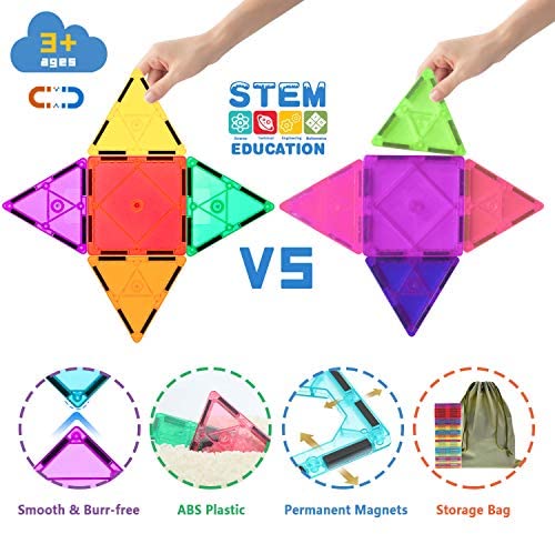 STARTER SET OF 52PCS TOTAL Package includes 52 magnetic blocks, an idea booklet and a storage bag. Small castle kit for beginners who want to have a try for the first time or just as a refill pack for existing magnet tiles kit. More pieces, more possibilities. SAFE PLAY STEM TOYS High-quality ABS plastic, geomagnetic material, round edge geometry shapes without sharpness, no harm to skin and no swallow mistake. Just feel free to challenge! Great montessori toy gift for toddlers, 3+ year old boys and girls. LEARNING WITH CREATIVE FUN Attractive transparent rainbow magnet toy set is designed as educational toys to help build kids sense of creativity and get better understanding of color, geometrical shapes and develop motor skills and creative thinking. Great for spacial reasoning, architecture, STEM and STEAM. PERFECT BOREDOM BUSTERS & MEMORY MAKERS Keep these magnetic tiles in your special boredom buster cabinet. Every time your toddler say “Im bored”, take them out and then he/she will pick an STEM activity to do for hours. We highly recommend parent-to-kid bonding play on weekends. SIMPLE STORAGE & KEEP FUN ON-THE-GO Stacking pieces stick together for easy cleanup, compact storage, and no more mess in your kids room. Comes with a portable pouch which is perfect for carry on-the-go and especially keeping hyperactive kids occupied on road trip.