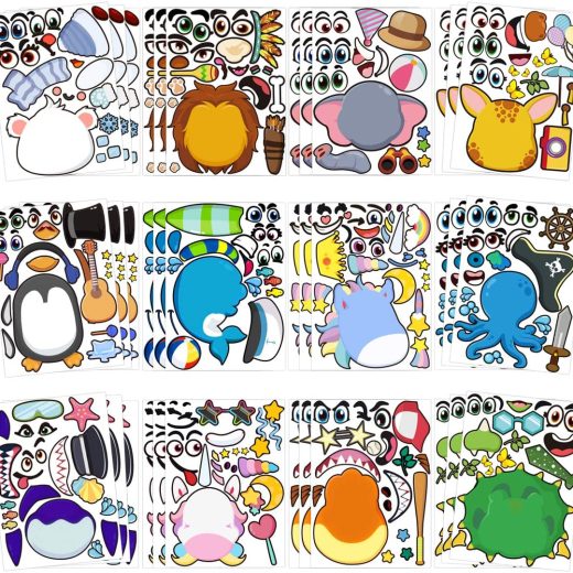 36 PACK ANIMAL THEME MIX AND MATCH STICKERS – A total of 36 sheets with 12 different patterns (3 sheets per pattern). Includes Lion, Giraffe, Elephant, Shark, Bears, Octopus, Dolphin, Penguin, Unicorn and Dinosaur with different body part stickers and accessories. Helps match with more rich expressions. CREATE AS MUCH AS KIDS LIKE – Designed for ages 3+. Each sheet has 3 different designs of eyes, mouths and even eyebrows to make whatever silly or cute faces your kids like. This set will help children develop creativity and hands-on ability. Every animal has different facial expressions and accessories. Children can create their favorite style. The collocation on each sheet can be used for other animals on other sheets. REUSEABLE MATERIAL OPTIMIZATION AND UPGRADING – Use thicker paper, that can be reused for many times. Cover the surface with protective film and lubrication coating, small stickers will never be ripped and there is no problem for repeated pasting. Widely Dimension about 8.5inch x 6inch/per sheet, there is no need to worry about putting the little stickers in the wrong place on the face, so as to bring creativity into full play. GREAT PARTY FAVOR – What kind of expression should the animal have, whether to wear a hat or glasses, it all depends on the children. They are the creators of the animal sticker world. These stickers allow children to concentrate. It’s perfect for rewards, group activity, art class, birthday gifts, festival gifts and party favors. Have fun! NO-RISK PURCHASE, FULL MONEY-BACK GUARANTEE – If youre unsatisfied with this item for any reason, just feel free contact us for customer service.
