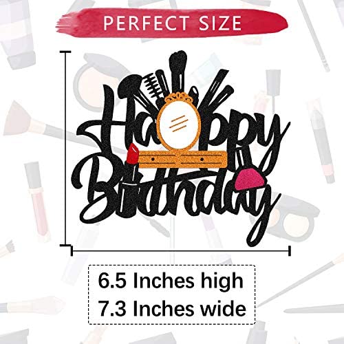 If you like to make a cake for a makeup themed birthday party, this glitter makeup theme birthday cake topper will be a good choice. Its shining and cute, which will make your cake look more delicious and eye-catching. They will be a big hit! Package Including: 1 pieces makeup cake topper 24 pieces makeup cupcake toppers Good Quality Material: High quality glitter black card stock and food grade paper sticks. Product Size: Makeup birthday cake topper size approx. 6.5 x 7.3 inches. Makeup cupcake toppers is approx. 1.1-2.8 inches tall The food grade paper sticks size is approx 7 inches.