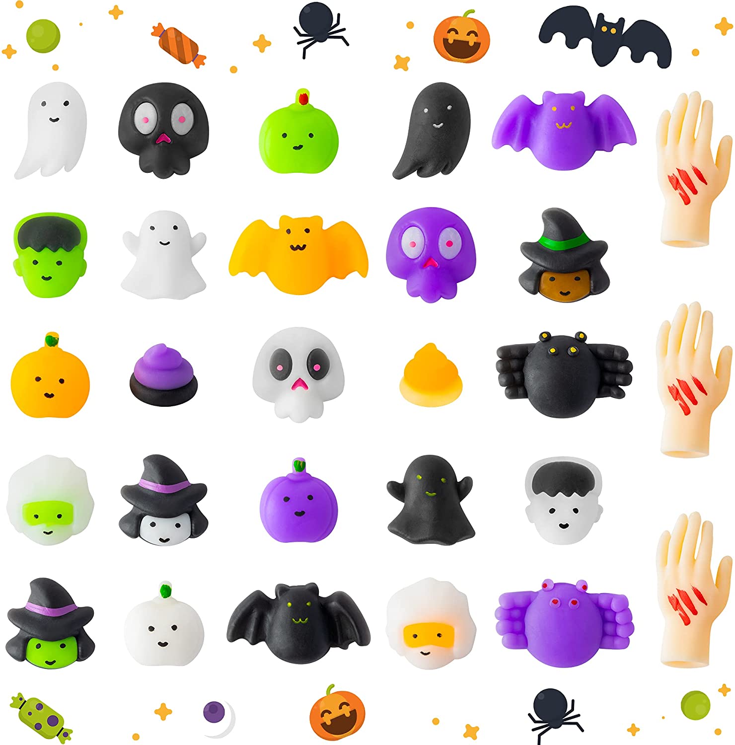 MALLMALL6 28pcs Halloween Mochi Squeeze Toys with Cute Face Kawaii Squeeze with Witch Pumpkin Bat Ghost Zombie for Halloween Decorations Party Favors Supplies for Kids Pressure Relief Squeeze Toys