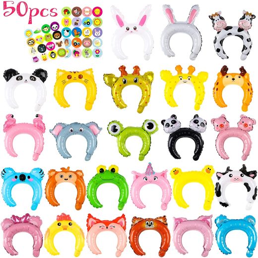 [Trendy Headband] Novelty animal inflation hair band head accessory, cute for kids to wear when traveling, or at theme park, zoo, swimming pool, beach in happy summer break! [Animals You Get] Contain zoo animal, farm animal, jungle animal, safari wildlife animals, such as tiger, panda, giraffe, flamingo, rabbit, koala, cow, elephant, fox, frog, also contains unicorn most kid favourite. [Amazing Party Favors] Party costume set animal balloon hair band for boys and girls to pretend play, it will be a surprising party supplies for children who obsessed with animal world! [Occasion] Birthday party, costume party, carnival festival, summer pool party, outdoor picnic, beach party, baby shower, photo booth props, pretend play, classroom supplies, school kindergarten drama props. [Our Package] 50pcs animal inflatable hair hoops (25 kinds), 72pcs animal stickers (4 sheets), 10pcs straws, portable, easy to pack and inflate, soft thick material, auto-sealing, no leaks, safe and harmless to children, size both well suit for kids and adult, please remember that not to over inflated the balloon headbands which may cause pop.
