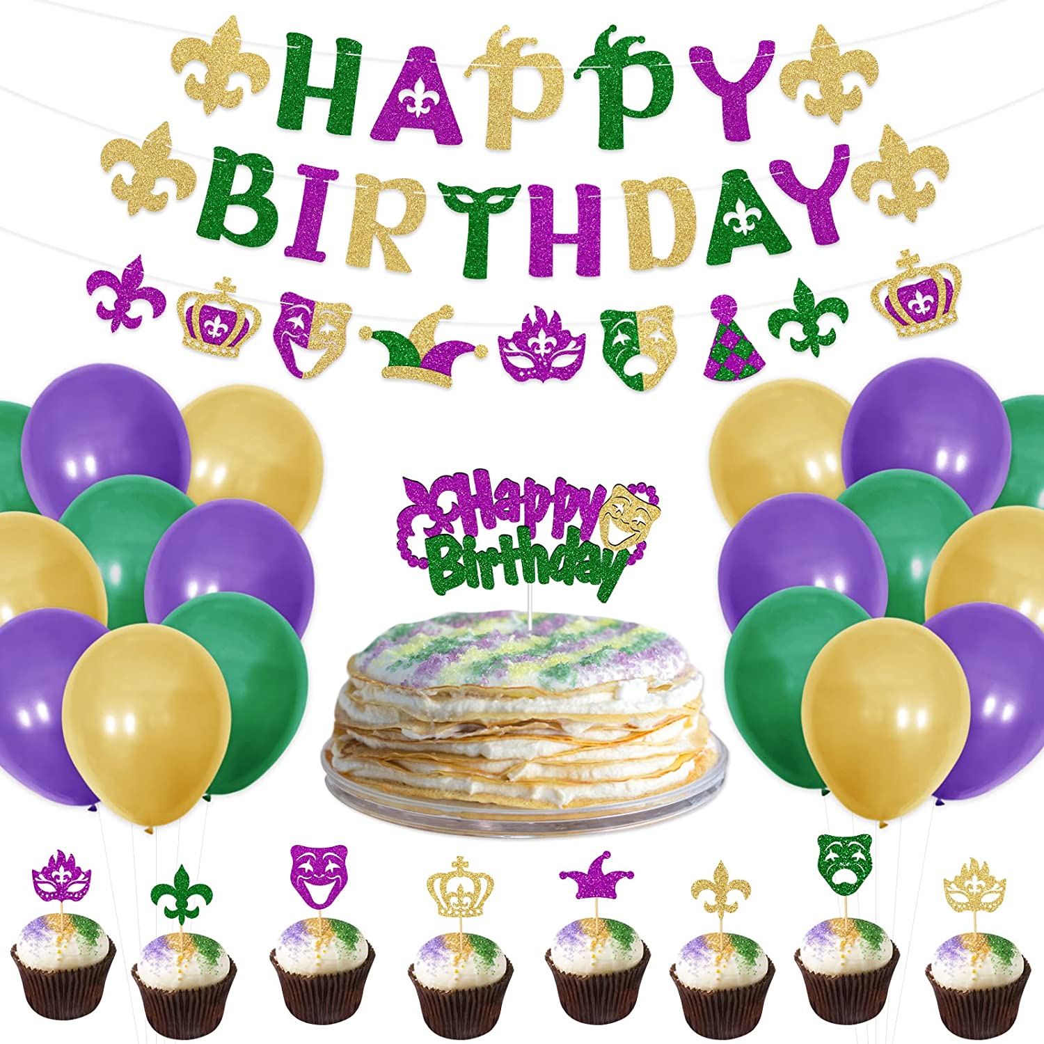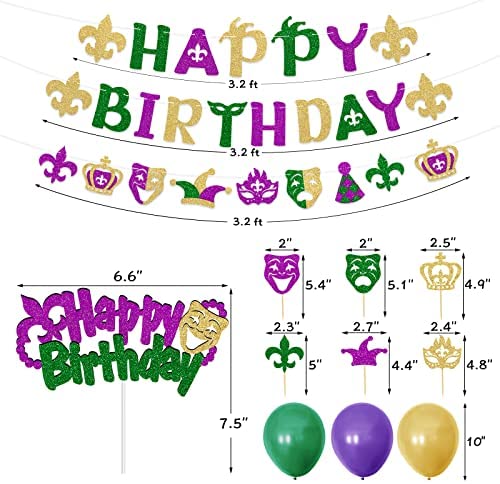 Mardi Gras Birthday Decorations — Its a great idea to decorate your birthday party with a specific theme like the Mardi Gras. You will have some new birthday decorations in your party varying from banners to balloons. Create a special party experience for your friends or families! What You Will Get — 1pcs HAPPY BIRTHDAY glitter banner, 1pcs Mardi Gras theme garland which decorated with patterns of clowns, fleur-de-lis, crown, tragedy, masque, and others, 24pcs glitter cupcake toppers, 1pcs HAPPY BIRTHDAY cake topper, 10 pcs purple & 10 pcs yellow & 10 pcs green printed latex balloons. Totally 57pcs in one set! You can decorate your party with them as you need. Suitable Size — The HAPPY banner, BIRTHDAY banner, and garland banner are about 3.2ft in length for each. The balloon measures 12 when inflated. The cake topper is made of glitter paper, in the size of 6.6*7.3. Easy to Assemble — Glitter banners are pre-strung well that you can hang them on the wall or any place you like. The cake topper and cupcake toppers are pre-assembled, you can insert them into the cake or cupcakes as you need. You need to inflate the balloons before using them for your party decoration. Consider Your Satisfaction First — If you are unsatisfied with our Mardi Gras theme birthday party decorations, please feel free to contact us. We strive to provide you with the best quality product and the best service.