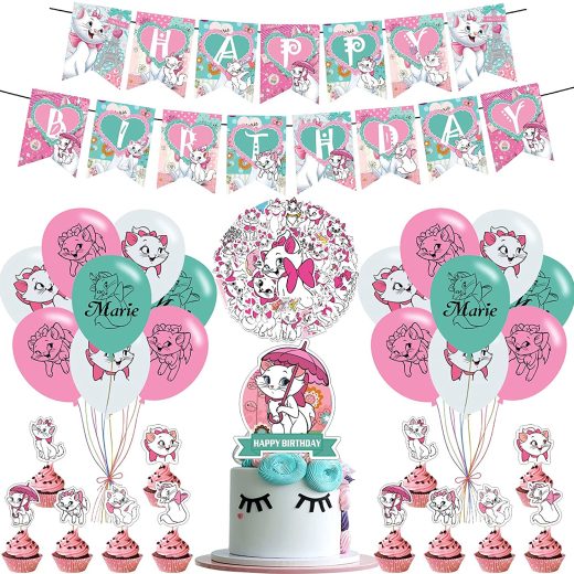 Marie Aristocats Cat Party,Marie Aristocats Cat Birthday Party Decoration,Marie Aristocats Cat Set for Kids with 1 Happy Birthday Banner, 12 Marie Cat Cupcake Toppers ,18 Balloons and 50 Stickers for Party Decorations