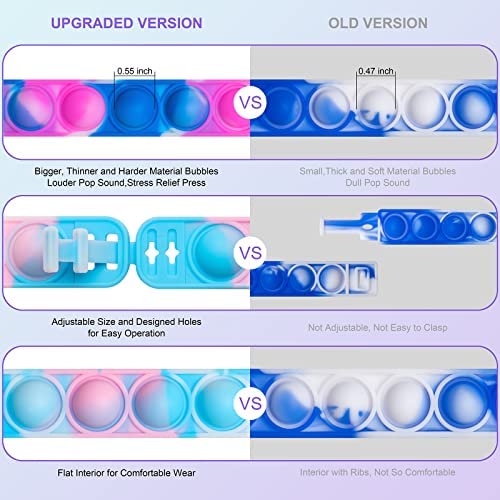Adjustable Size- The length of the wristband can be adjusted from 2.4 inch – 2.8 inch diameter, which is suitable for kids and adult to wear and play. Louder Pop Sound- Its made of silicone which offers the bracelet a smooth surface, soft and elastic feeling. The meterial is a little harder and thiner at the pop bubble area, and the bubble is larger to achieve a louder Pop, Pop sounds, very relaxing and cheerful. Renewed Buckle Design- We have especially redesigned the buckle of the bracelet. The four buckle design not only allows a wide adjustable size, also it is more easy for you to wear and remove. Stress Relief Toy- With the features of multicolor, soft touch and pop sound, the bracelet is a great way to relax and keep busy. It will effectively help to relieve anxiety and stress, restore the mood. Pop idea for people with the autism, the ADHD, children and adults who need to relieve stress. Its also effective for regular overworked and stressed out people. Wide Range of Applications- The bracelet is very lightweight and potable. Wearing it on the wrist, so is can be used for travel, on the road, office, party favors, break between classes, anxiety, stress, irritability, etc. The bulk party pack bracelet are also great thanksgiving day gift and Christmas gift for kids and friends.