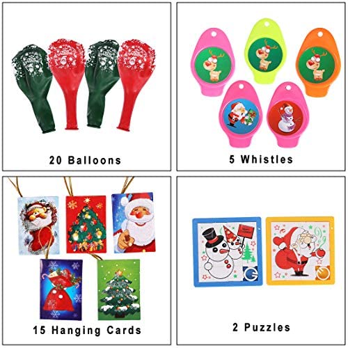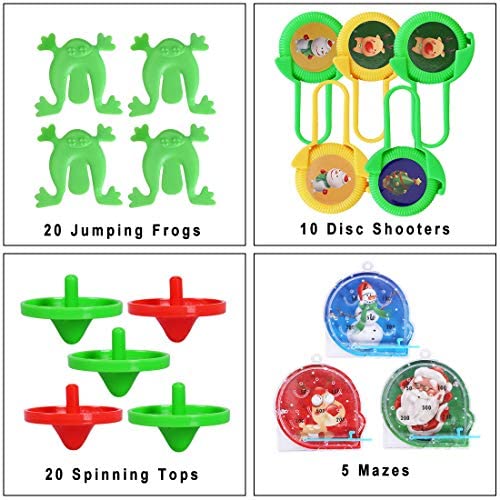 1. Large assortment – There are 15 kinds of assortment toys (128pcs)s. It includes a wide range of toys such as: Mazes, Tattoos, Whistles, Yoyo Balls, Rings, Pull Back Cars, Star Glasses, Balloons, Rainbow Springs and much more fun items. 2. Huge variety – This Christmas party toys packing 128 pieces of fun, you get an amazing variety of toys, such as Christmas, carnival prizes, treasure box prizes for Teacher, treasure chest toys for classroom, birthday party toy assortment, Pinata filler toy, Halloween prizes and toys, goody bag toys, prize box toys, party giveaways, etc. 3. Random color – The Christmas toys are nice and there is a variety. All products are random color. Almost is Green or Red. You can receive 15 kinds of colorful party favor toys. 4. Various applications – There are 15 kinds of playing methods to use these assortment toys. Children are playing fun with sister, cousin, friends. Perfect for your Christmas, Birthday, Party, Thanksgiving Gift, and so on.