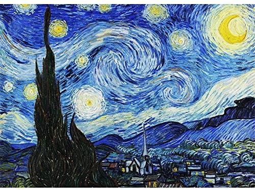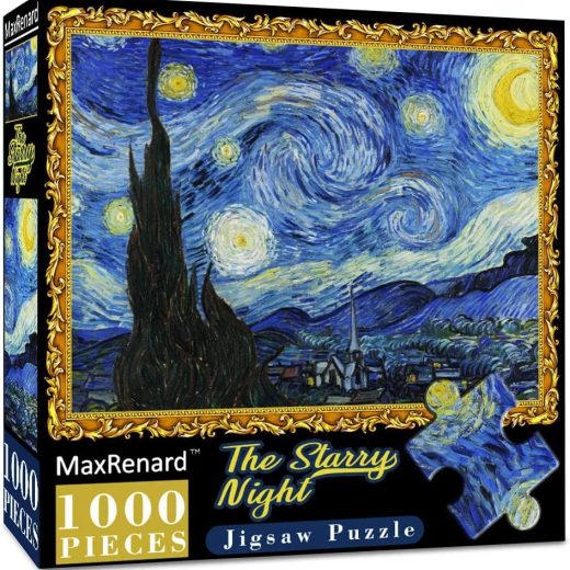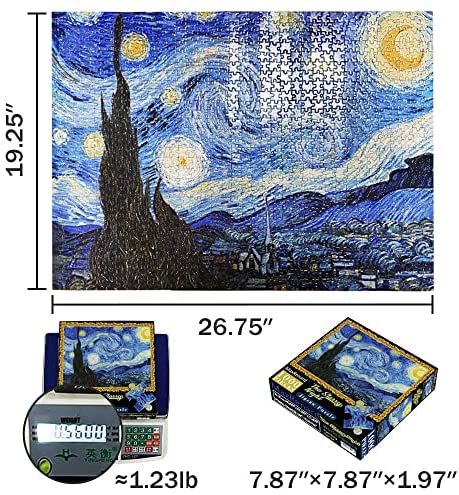 The Starry Night — It is one of Van Goghs masterpieces. In this jigsaw puzzle, you can carefully observe famous arts at close range. Feel the charm of these paintings through pieces of jigsaw puzzle. Great Material and Contents–The puzzle of The Starry Night contains 1000 pieces puzzles and a poster. Finished size are: 68*49cm/26.75x 19.25. High quality recycled cardboard, sturdy and bend-resistant. Special surface film treatment, color remains freshness after long time storage. Challenge and Fun–Its not so easy to complete the puzzle, but once finished, you will be proud of yourself. Jigsaw puzzles quiet the mind and induce a state of creative meditation. They tap into our creation and rewire our brains to make connections the most valuable parent-child game. Special Gift– If youre looking for something special as a gift, dont miss this beautiful puzzle. Artwork painting never go out of style. Perfect present for birthday, graduation, Christmas, Thanksgiving, etc… Missing Support–If you received the puzzle and has missing parts(Its little possible), please contact seller without hesitation, and we will provide you a satisfied after-sales service.