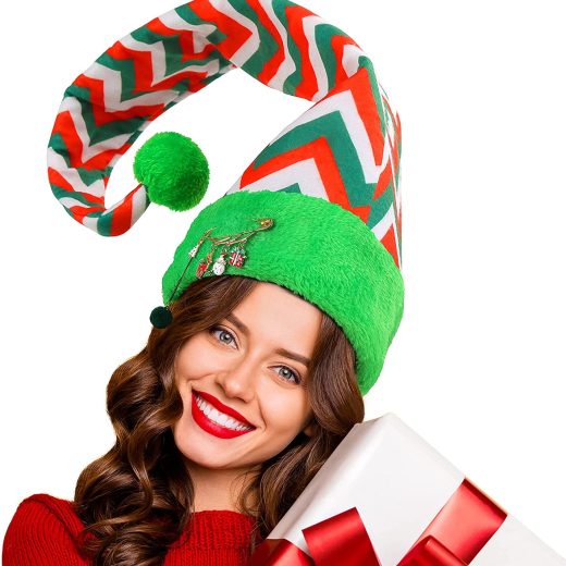 What You Get – 1× Striped Felt and Plush Elf Hat (bendable) , 1×Christmas Theme Pin Brooch with Charms (featuring snowman, reindeer and Christmas g…