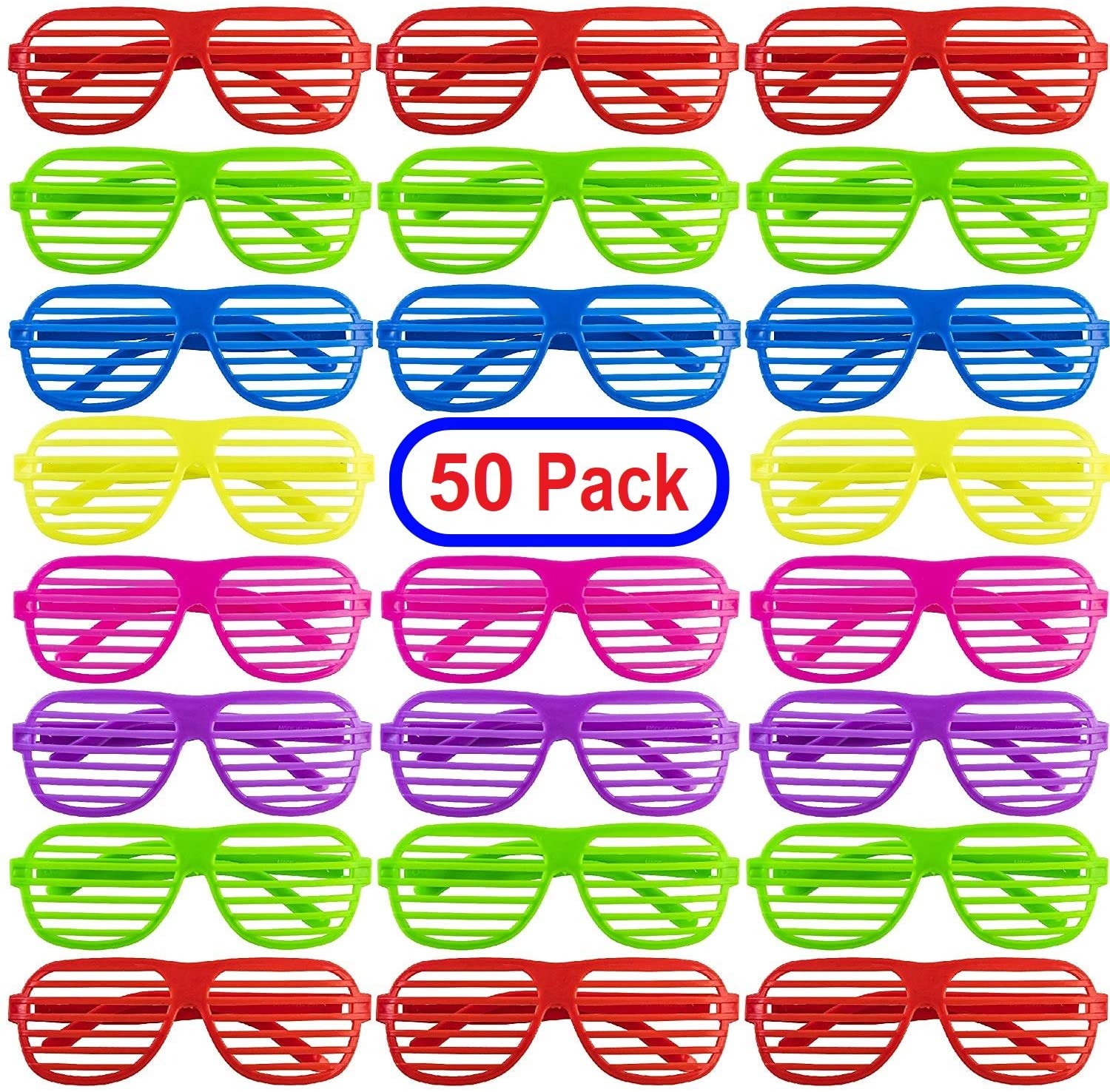 50 pack of colorful shutter shade glasses for parties and events sunglasses 6 vibrant colors, including: pink, red, blue, purple, green and yellow These party glasses will surely be the talk of your party! Shutter shade fun photo props that kids and adults will love Makes perfect hand outs for moms, teachers, and any party arranger
