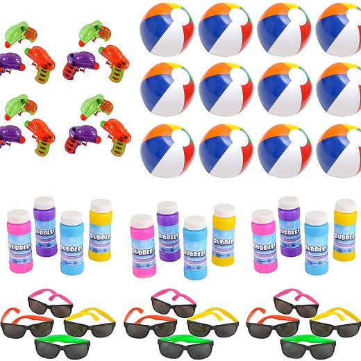 MEGA BEACH AND POOL PARTY FAVOR ASSORTMENT, TOP POOL TOYS FOR FUN IN THE SUN! INCLUDES: 12 NEON PARTY SUNGLASSES in 4 assorted colors. A favorite eye catching party favor for both kids and adults. 12 12 INFLATABLE BEACH BALLS in assorted colors. Super sized beach balls for superb fun! 12 NEON EASY GRIP SQUIRT WATER GUNS in assorted two tone designs. Cool party favor or carnival prize for super soaking outdoor fun. 12 BUBBLE BOTTLES WITH WANDS. 2 oz bubbles, a classic favorite beloved by both kids and adults, dont let the fun times blow away!