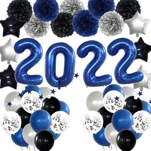 MEIWUTIE New Years Eve Party Supplies 2022, Class of 2022 Decorations Blue and Black, Fiol Balloons Banner Flower Pom Poms Circel Garland for 2022 Graduation Decorations