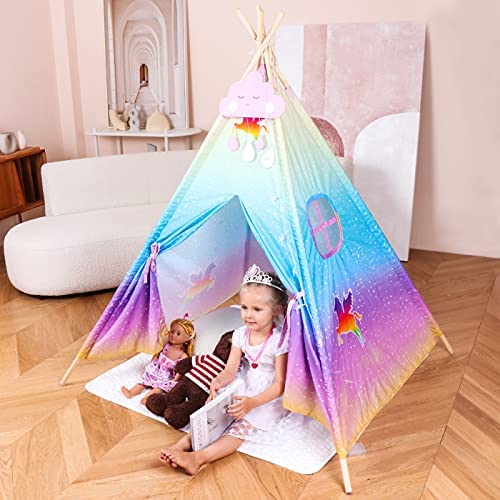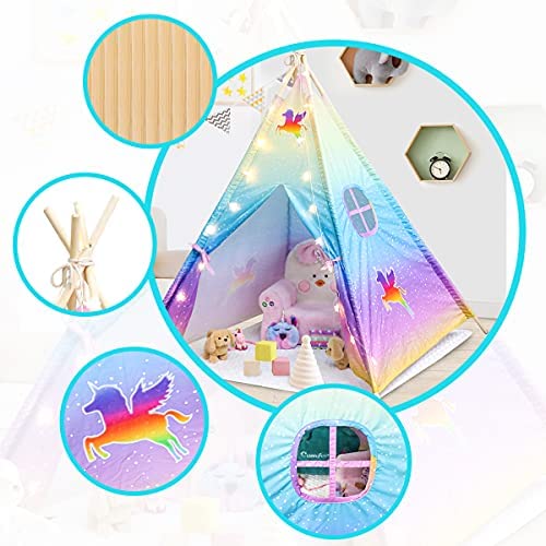 Meland Teepee Tent for Kids – Canvas Foldable Teepee Play Tent with Star Lights, Padded Mat & Storage Bag, Birthday for Kids Indoor & Outdoor Playing (Unicorn)