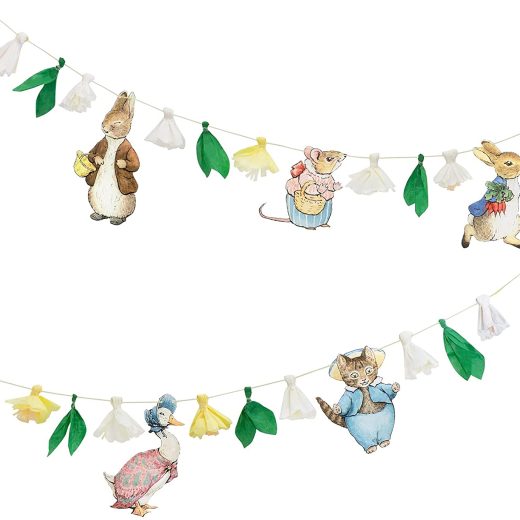 Make a party for little people look totally adorable with our Peter Rabbit & Friends Garland. It measures 10 feet, so will make a really stylish impact to delight your guests Everything you need to decorate the party room – perfect for a birthday party or baby shower Contains 5 beautifully illustrated and crafted characters, including cheeky Peter Rabbit Also features pretty floral pennants and is pre-strung on a natural cord Part of our Peter Rabbit & Friends party supplies range