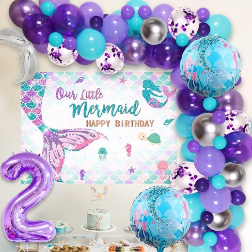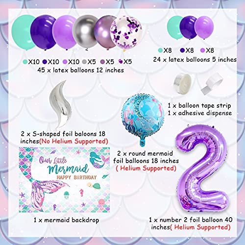 Mermaid 2nd Birthday Party Decorations for Girls Mermaid Tail Balloon Garland Kit Blue Purple Silver with Happy Birthday Backdrop, Number 2 Foil Balloon for Little Mermaid 2nd Birthday Party Supplies