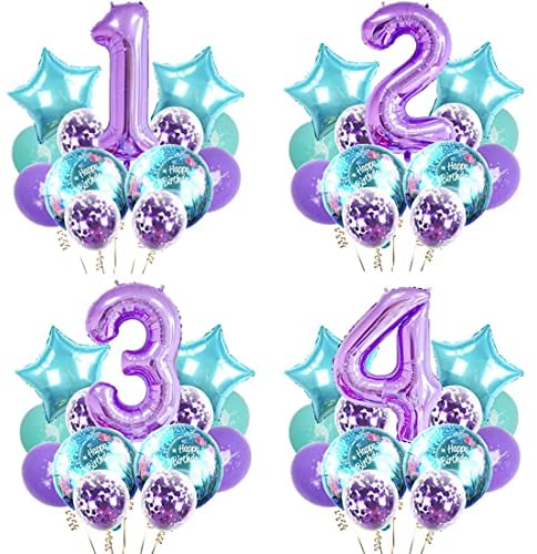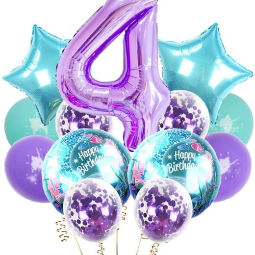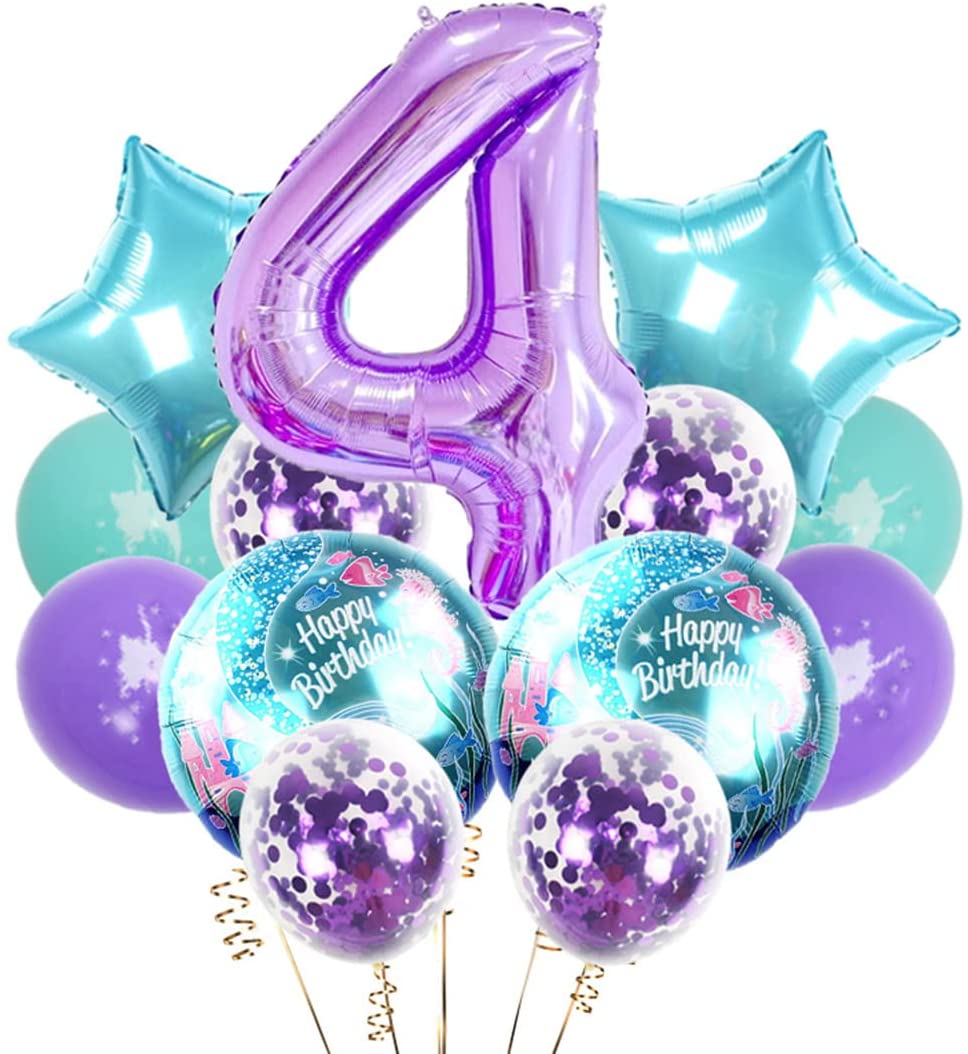 Mermaid Themed Balloons Party Set – Great for wide scene,1st birthday party decoration,baby showers,gender reveal,ocean theme party,under the sea party,princess birthday party,mermaid bachelorette party decorations,anniversaries,home office mermaid backdrop decor,perfect mermaid party decorations for adding romantic and festive atmosphere. Great Value Pack – 1pc 40”big number 4 purple balloon,2pc 18‘’ round mermaid foil balloons,2pc 18” star foil balloons,12”mermaid latex balloons 2 teal 2 purple ,4pc 12” purple confetti balloons,1pc 10 meters ribbon. Premium Material – Our balloons in this kit are made from thick and non-toxic natural latex and Mylar, which can be used repeatedly. they can be inflated with air or helium, absolutely environmental-friendly. Instructions – Foil balloons self-sealing valve,convenient inflation and deflation.inflate using the a straw or an air handheld pump,After inflating the confetti balloons, rub the surface of the balloons on carpet or with a dry towel to help the confetti stick to the.They can be filled with helium or air.only a balloon filled with helium can float. Our Service – If you have any problem or you need help, please contact us,we will provide the best service and guarantee.