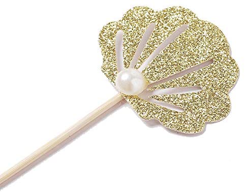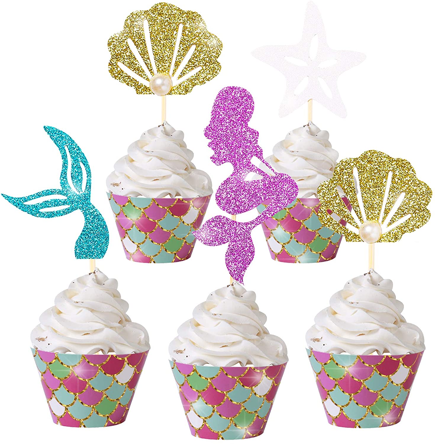 Mermaid Cupcake Cake Toppers Wrappers Mermaid Party Decoration for Baby Shower Kids Birthday Party Favor Supplies 24PCS Mermaid Tail Seashell Starfish Food Picks and 24PCS Wrappersu2026