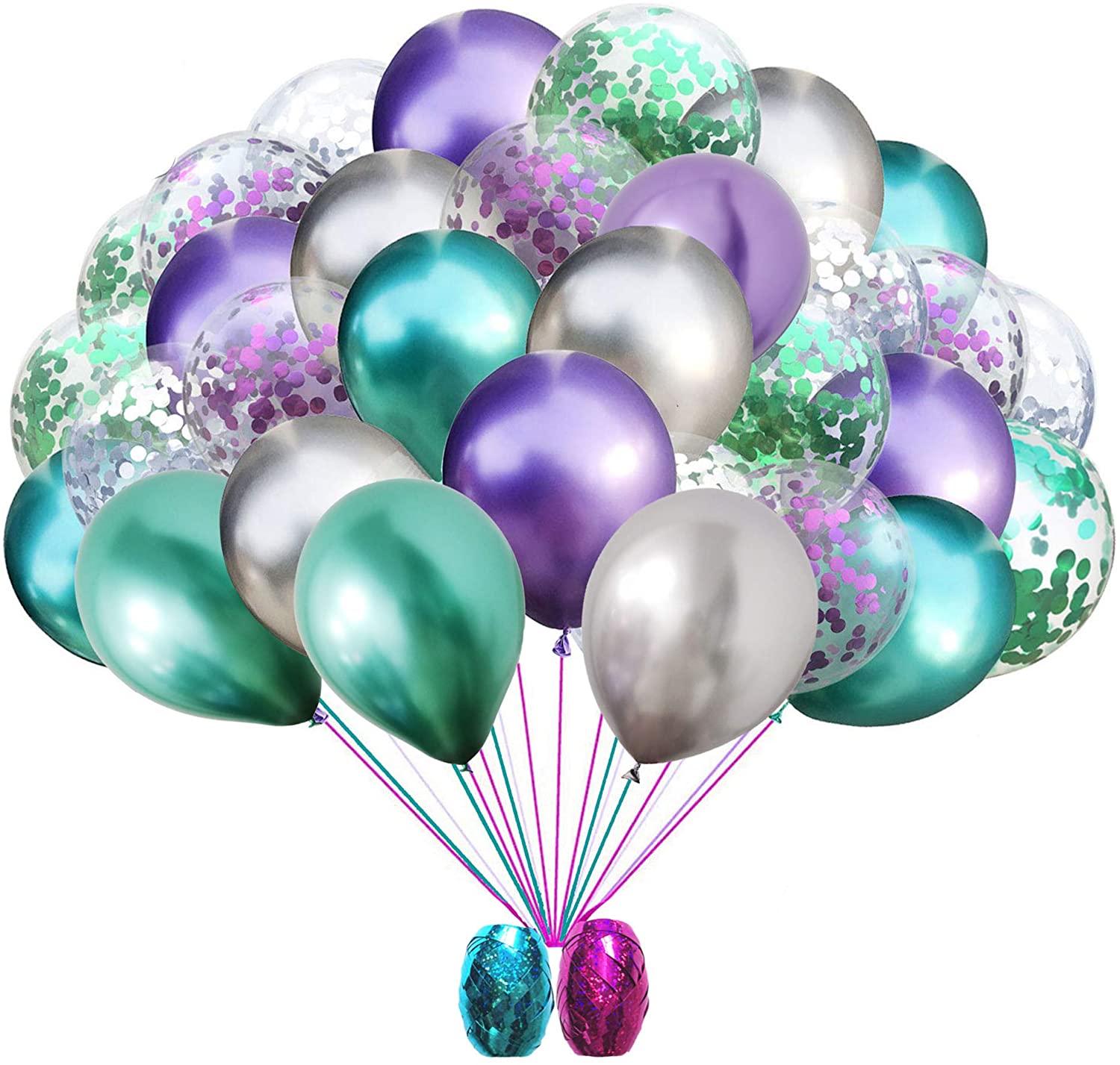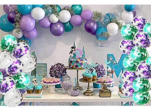 Mermaid Party Balloons, Green Purple Metallic Balloons with Glitter Confetti Clear Sparkle Decorations with String for Baby Shower Birthday Party Supplies (Set of 32)