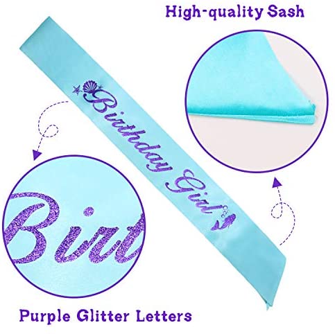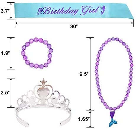 What you will get1pcs glitter mermaid birthday sash, 1pcs purple gem crown tiara, 1pcs mermaid tail pendant necklace, 1pcs purple bead bracelet. It is a super cute mermaid birthday gift for little girls! Product SizeThe birthday sash measures 3.7 wide and 30 long end to end. Purple glitter letters and comfortable to wear. The height of the tiara is 2.5 inches. The length of the necklace is 9.5 and the diameter of the bracelet is 1.9. Perfect for most children. Soft Mermaid SashMade of satin ribbon, sparkles are encased in the lettering and will not spread to your clothes or surroundings! The crown needs to be assembled and snaps into place. Its a smooth surface and wont hurt a childs head. The necklace and bracelet are made from elastic lines, which its easy for children to wear. Perfect addition to Fiesta De SirenaPerfect to make an impression at your kids birthday party. The mermaid decoration kit will dress up your child as a little mermaid and make the party more memorable. After-sale ServiceDo not miss it and add it to your cart now. If you are not satisfied with it, please feel free to contact us.