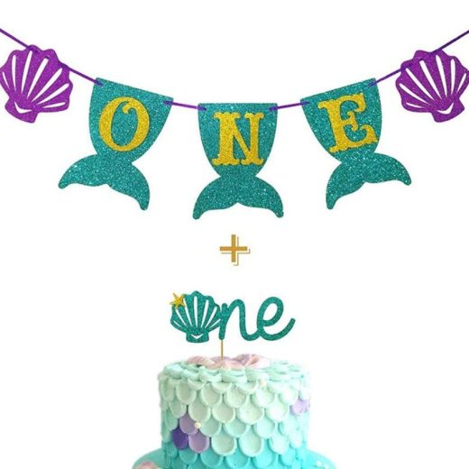 Mermaid Theme First Birthday Decorations Party Supplies for Baby Girls, High Chair ONE Burlap Banner + NO.1 Crown + ONE Cake Topper (Blue)