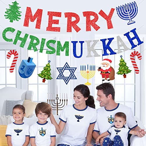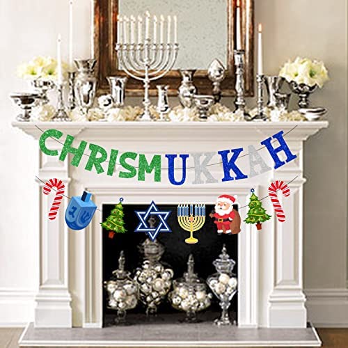 Merry Chrismukkah Banner Silver Glitter Christmas & Hanukkah Decorations, Chanukah Dreidel Garland for Illumination Christmas Xmas Festival Party Supplies