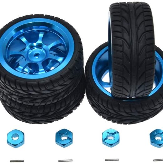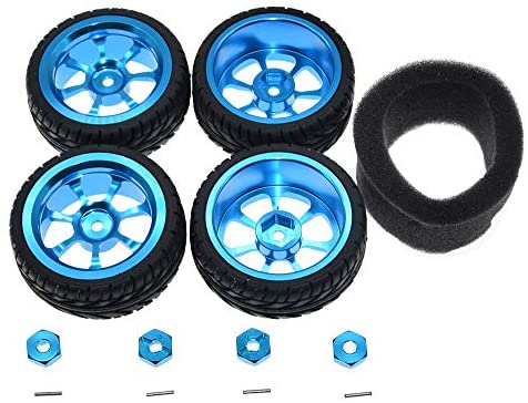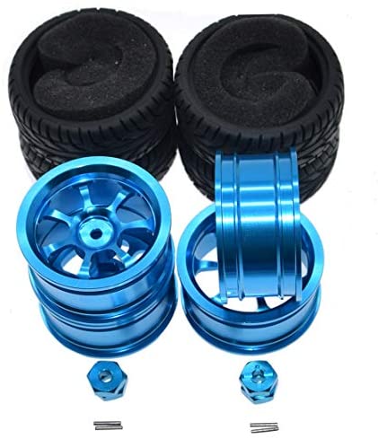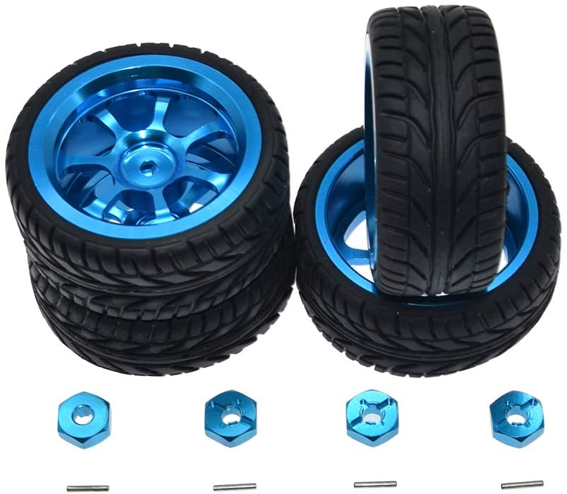 Package included(as photo showed): 4 x Aluminum alloy rims. 4 x plastic tyres. 4 x Aluminum alloy hex adapters(the pins included). 4 x sponges.