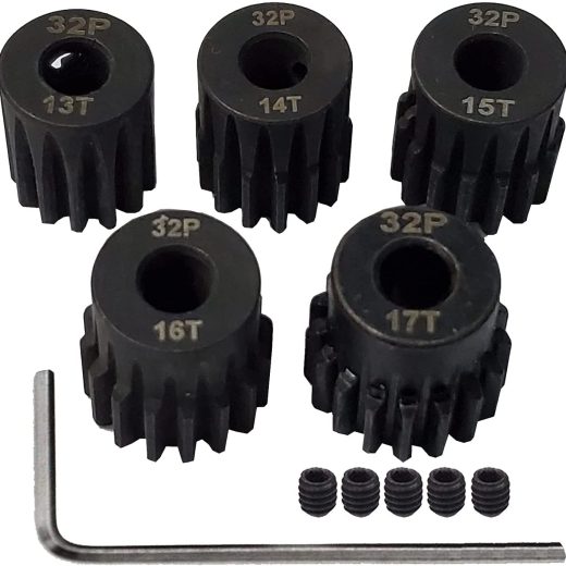 Description:Metal steel to increased wear resistance and improve fatigue lifeNitrided to enhanced hardness corrosion resistanceTooth count: 13T 14T 15T 16T 17TTooth pitch: 32 pitch(0.8 module is the same as 32 standard)length: 14mmFor shaft: 5mmPackage include:1 X 32p 13T pinion gear1 X 32p 14T pinion gear1 X 32p 15T pinion gear1 X 32p 16T pinion gear1 X 32p 17T pinion gear5 X Screws1 X Hex KeyMake sure you thread lock the grub screw. They are hard to find when they fall out.Larger gears will result in higher speeds while smaller gears provide more torque.For quicker acceleration go for a smaller pinion gear (with fewer teeth) and larger spur gear (with more teeth).Your car will accelerate off the mark very quickly with more torque, and youll also benefit from cooler running temperatures, extending the life of your motor and ESC.How to install the pinion gear:You will probably need to loosen the motor a bit, in order to fit the pinion gear on. Make sure you lock it in place on the flat portion of the motor shaft.When you are tightening it back up, make sure you leave about a gap between the pinion gear and the spur gear. That gap will be very small. It should be about the thickness of a piece of paper.At last, if the motor you are using has a 1/8 inch shaft with an 32p spur gear then it should fit… Its not about what vehicle you have necessarily…