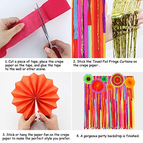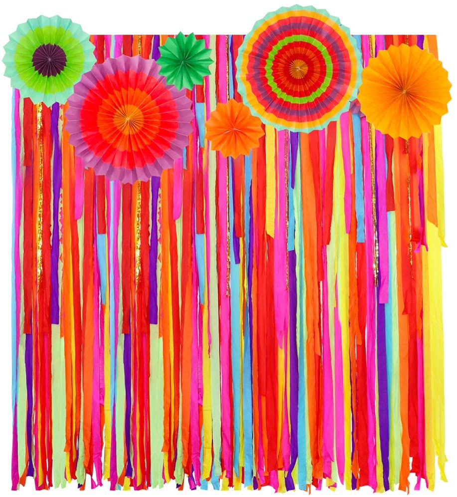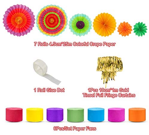 Fun DIY Fiesta Backdrop Paper Fans Kit – Throw the perfect Fiesta, Cactus, Llama party with this colorful Fiesta Party photo backdrop! Easy to do and Tons of Fun! These vibrant Fiesta Paper Fans are easy to assemble and are always the perfect accent for your event or holiday decor! Group together for a fun backdrop or hang separately to add some dimension to your party Unique and Special Design – This fringe photo backdrop are made of high quality material, the tissue paper hanging streamers and colorful paper fans are made of high quality paper, each fan has an adhesive strip for permanent use or paperclips included for temporary use as well as a string attached for hanging. All set is bright and fresh, with excellent workmanship, soft and smooth. All in One Mexican Fiesta Decorations Set – You will get: 6Pcs/Set Colorful Paper Fans, 7Pcs 4.5cm*25m colorful crepe paper ( including 1*Red, 1*Orange, 1*Rose Red, 1*Green, 1*Purple, 1*Sky Blue, 1*Yellow); 1Pcs 10cm*1m Gold Tinsel Foil Fringe Curtains, 1 Roll Glue Dot. Easy to Assemble – This Fiesta Cinco de Mayo phtoto props is very easy to use! Just unroll the crepe paper, glue or tape one side of the crepe paper and let hang, simply hang or tape the colorful paper fans to the crepe paper as you prefer, hang them from the ceiling, above a table, under the verandah, or from branches in trees, and anywhere you need. Perfect for Multiple Occasions – This set is great for creating a wonderful party display for Fiesta Party, Mexican Party, Cinco De Mayo, Taco Tuesday, Taco Bout a Party, Taco Party or Mexican Fiesta Themed bachelorette party, birthday party, baby shower, bridal shower, bubbly bar, backyard party, cactus party, Llama party and more! You can use them alone to decorate different party space or arrange them together to make a colorful party backdrop or photo booth backdrop.