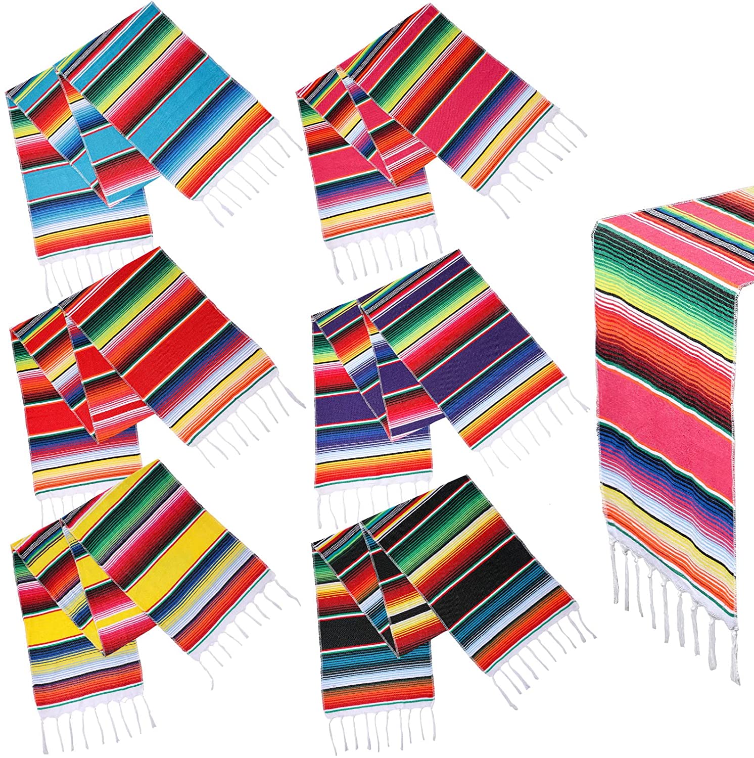 6 Pieces Mexican table runner serape tablecloth fiesta centerpieces Mexican shawl for Mexican theme party decoration Cinco de Mayo Fiesta birthday party Features:Mexican table runner: Make your meaningful moments even more memorable, suitable for Fiesta, Cinco de Mayo, Mexican themed party, birthday, wedding decorations.Wide occasion: These Fiesta tablecloths are good additions to party background, table centerpieces, candy buffets, dessert tables, dining table, fireplace, wall decoration, outdoor table, picnic rugs and so on.Colorful striped design: Vibrant colors represent the rich culture and festival spirit of Mexico, classic stripe pattern in various colors, you can also use it as shawl on Mexican theme party, Cinco de Mayo, Fiesta, birthday party.Specification:Color: show as picturesQuantity: 6 piecesSize: 14 by 84 inchesPackage included:6 x Colorful Mexican table runners