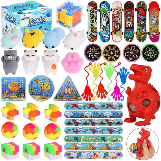 Bundle Prize Toys Assortment: This novelt toy set includes 48 pcs sensory toys. Including 8 dinosaur slap bracelets, 8 mochi squishy toys, 8 sticky hands, 6 finger skateboards, 4 spinning tops, 9 puzzles (3 Kinds), 3 shape maze puzzles, 1 cube maze, 1 dinosaur squeeze ball. Fun Kids Party Toys: Mochi squishy toys and sticky hands are so great for releasing your body and mood. They will help you boost hand blood circulation. Maze Puzzle toys can exercise childrens intelligence. Perfect fits for party favors goody bags. Therapy and Calm Down Toys: These toys help promote a sense of calm, reduce stress, anxiety and can increase focus and attention. Great gadgets for ADHD, ADD, autism, quitting bad habits, etc. Various Applications: Carnival prizes, birthday party favors for kids, pinata filler for boys and girls, treasure box prizes , prize box toys for classroom rewards, toy prizes for carnival game, treasure chest toys for classroom, birthday party toy assortment, goody bag toys, birthday party giveaways. High Quality & Safe for Children: Meets US Toy Standards. Safety Test Approved. Durable. Superior Quality. Deluxe Set. Non-Toxic.