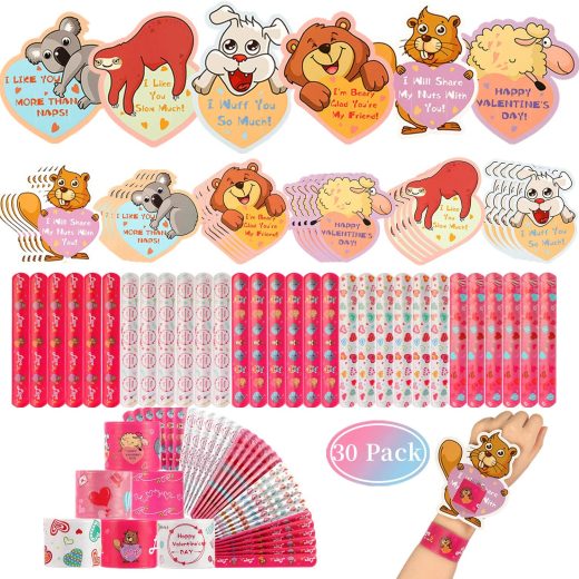 30 Cute Valentines Day CardsThe package of kids valentines day decorations comes with 6 styles of animal-themed Valentine cards, 5 for each style, 30 in total( puppy, squirrel, sheep, sloth, koala, bear). Each design has a special animal-related punchline of greeting words, children just sign To and From and can be given as a valentines gift for friends, and family to share their love. 30 Colorful Valentines Slap Bracelets30 Valentines day slap bracelets for kids, in 6 different styles, 5 for each style, they are in a romantic pink color series and printed with different Valentines Day elements of hearts, animals, Cupids arrow, LOVE, etc, kids will love them, and you can choose according to your preference to add great fun for Valentines day decorations. Premium-Quality MaterialOur valentines day cards for kids classroom are on high-quality cardstock, printing with cute animal designs. And the valentines day slap bracelets are made by durable metal core inside, tightly wrapped with thick soft faux leather type PVC material outside. Whats more, the edges are firmly sealed, safe and gentle for skin touch, which wont cause harm to kids hands and wrists. Easy to UseThe kids valentines day cards measure 3-5in. Each slap bracelet measures 8.25 in. A fun classic valentines day decorations perfect for all ages. Just simply slap the bracelet on your wrist, or insert the valentines day card then wear it, it will form a comfortable fitted grip based on your wrist size. You can also stack them up, collect them, to create your party style at festivals or carnivals. Ideal Kids Valentines Decorations for Party These fun valentines cards for kids school classroom add a special style to Valentines day occasion, perfect for Valentines day party favors, kids valentines school classroom activities, valentines day decorations, kids valentines gifts, birthday presents, game prizes, prizes for students, which matches with Valentine’s Day slap bracelets well to cater the valentines happy atmosphere, your kids will surely have fun!