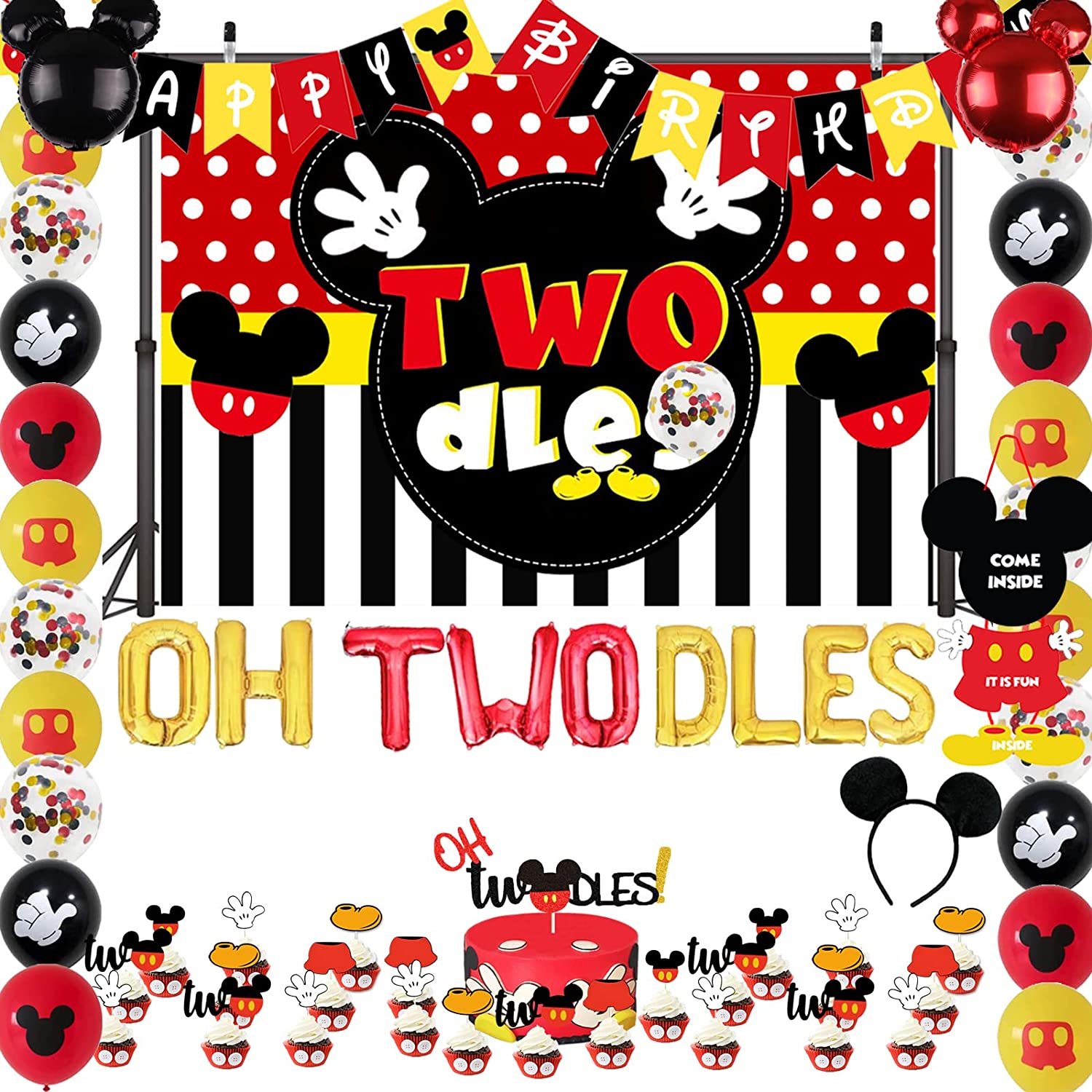 Mickey 2nd Birthday Party Supplies Decorations, Oh Twodles Balloons, Mickey Two Photography Backdrop, Mickey Second Birthday Cake Cupcake Topper, Mickey Welcome Sign Door Hanger, Mickey Ears Headband