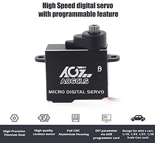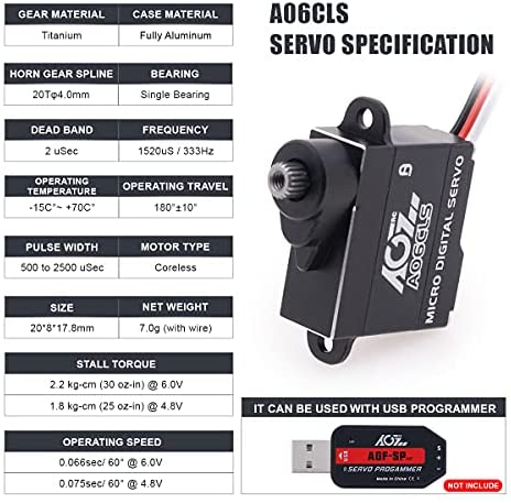 AGFRC Mini-Z-Car Micro Steering Servo – 6g High Speed Full Metal Gear Mini Digital Coreless Servo for Mini Z Car (A06CLS(Purple)) Feature Ultra light weight mini z servo High accuracy titanium gear High quality coreless motor Fast cooling aluminum case DIY parameter via USB programmer card Design for mini z cars, 1/18, 1/24, 1/27, 1/28 Scale Cars such as GL Racing GLD, GLA V2.1, GLR, GLF-1, GLR GT. Note: USB servo programmer is not included, if need it, please search the Asin: B08MZY9NHY Stall Torque 1.8 kg-cm (25 oz-in) @ 4.8V 2.2 kg-cm (30 oz-in) @ 6.0V Operating Speed 0.075sec/60° @ 4.8V 0.066sec/60° @ 6.0V Specification : AGFRC Control System: PWM, 1520uS/333hz Dead Band: 2 uSec Limit Angle: No limit Operating Travel: 180°±10°, 500 to 2500 uSec Horn Gear Spline: 20T-f4.0mm Bearing: Single Ball Bearing Operating Voltage: 4.8-6.0V Gear: Titanium Motor: Coreless Motor Case Material: Aluminium Size: 20*8*17.8mm (0.79*0.31*0.70 in) Weight: 7g (0.25 oz) CE Certification: Yes Wire: JST 60mm / 28AWG Package Included: 1 x AGFRC A06CLS Coreless Servo 1 x 20T Metal Servo Horn 1 x Accessory Kit