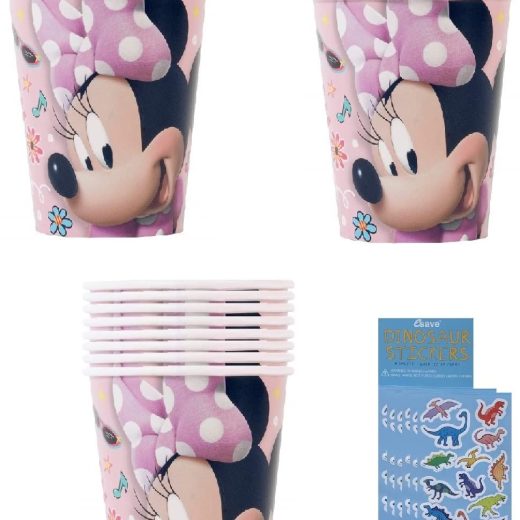 Minnie Mouse Birthday Party Supplies Bundle includes 24 Paper Cups and 8 Dinosaur Stickers