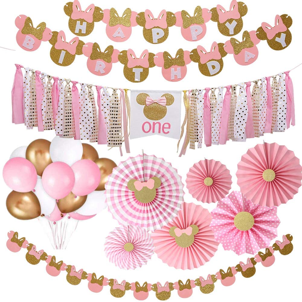 Minnie Mouse Party Supplies Girls 1st Birthday Party Supplies Pack,Minnie Happy Birthday Banner, Minnie Mouse High Chair Banner,Minnie Paper Fans,Minnie Mouse Garland, Balloons (39 Pcs Pink and Gold)