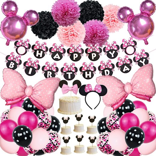 Minnie themed birthday party decorations for girls birthday happy birthday banner light pink minnie cupcake toppers wrappers What you will get: 1 Minnie Happy birthday banner 10 hot pink latex balloons 10 light pink latex balloons 5 hot pink and black confetti latex balloons 2 hot pink minnie head foil balloon 2 Bow Balloons 9 Flower Pom Poms 12 minnie cupcake toppers 1 Bow cupcake topper 1 Pink minnie mouse headband 2 colorful ribbons.