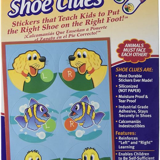 Help your children become self sufficient with the Mom Invented Shoe Clues. Shoe Clues will help kids recognize which shoe is the left and right. This product will also help teach them from left to right.