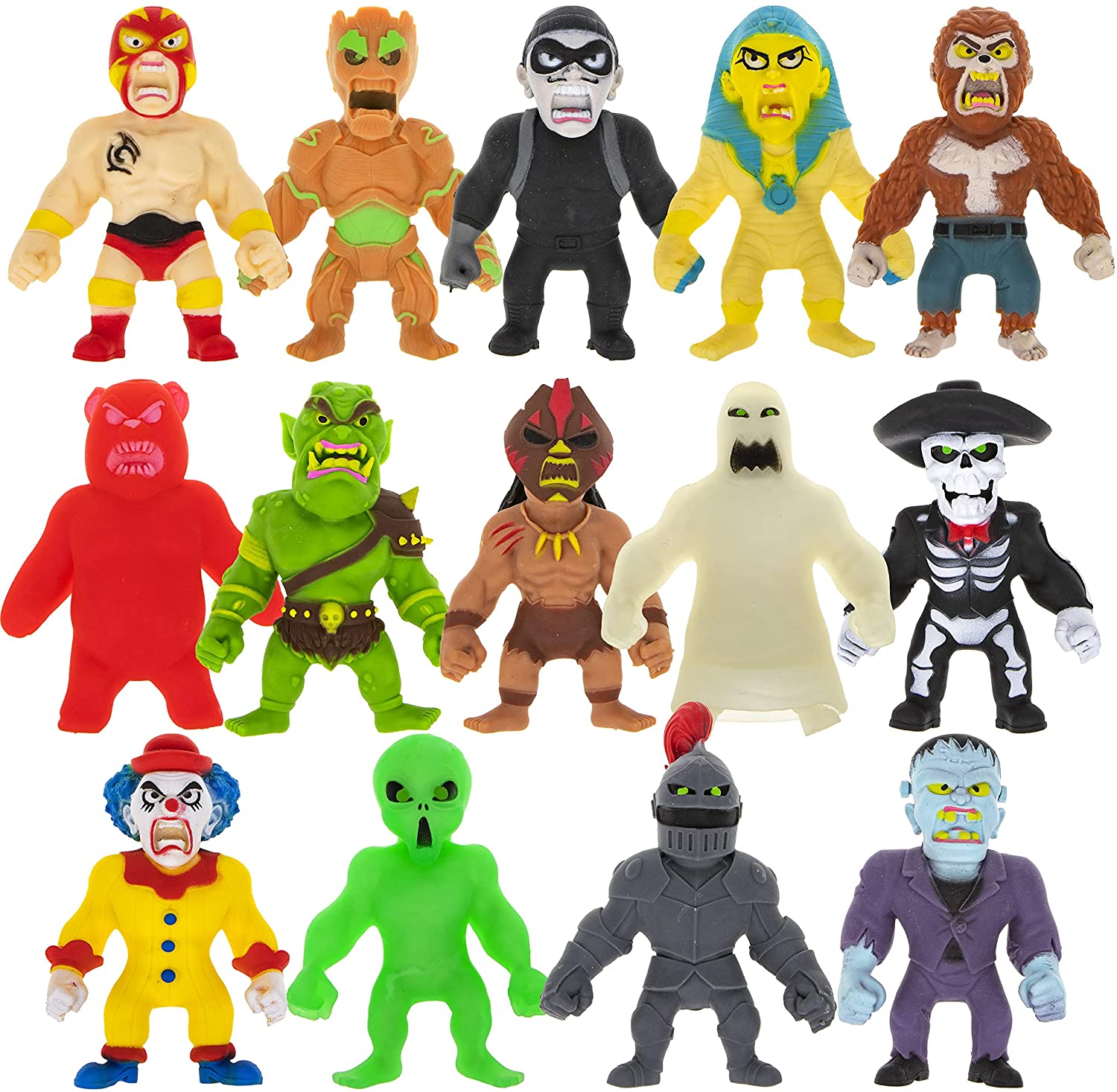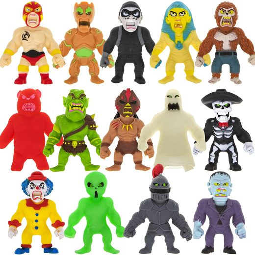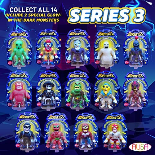 CALLING ALL MONSTER LOVERS!This set of 14 creepy-cool stretchy creatures from Monster Flex includes all the classic monsters kids can’t get enough of, but in super stretch form! Have epic monster battles right in your room and find out once and for all who would win in a fight between your favorite frightening beast.MONSTER FLEX FEATURES:- 14 Unique Characters (no duplicates!) – Collect them all and find the secret glow in the dark monsters!- High-quality, strong material- Perfect for sensory, stress-relief play2 DIFFERENT SETS AVAILABLE TO COLLECT:- SERIES 2: blue ninja, ghoule, red ninja, zombie, pumpkin man, swamp monster, gargoyle, vampire, scary mask, werewolf, mud monster, slime creature, bigfoot and lizard man.- SERIES 3: This set includes Frankensteins monster, black knight, alien, ghost, evil clown, skeleton, ape man, tiki man, ogre, mummy, thief, bear, tree man and wrestler.STRETCH YOUR IMAGINATION!Whether you are looking for fidget or sensory toys or just a good time, these extremely stretchy monsters toys are perfect for boys and girls to expand their imagination! Similar to fidget monkey noodles and stretch strings, these monster stretch toys make ideal classroom sensory items or anger management toys. Stretch, squeeze and twist your way out of a stressful, angry or anxious mood. It’s a perfect toy for calming corner items for home and classroom.MEGA STRONG STRETCHNo matter how hard you pull and stretch these toys were made to last! It’s the stretchy toy that will outlast the strongest squeeze you got! It’s the stretch guy monster toy with the mega strong stretch!PERFECT PARTY MONSTERSThese fun monster figures are an amazing gift for any occasion and will be a hit at any kids party. The set makes a great gift for your little monster collector or they can be split up to go into goodie bags or as party favors for kids birthdays. Kids will enjoy trading for their favorites!