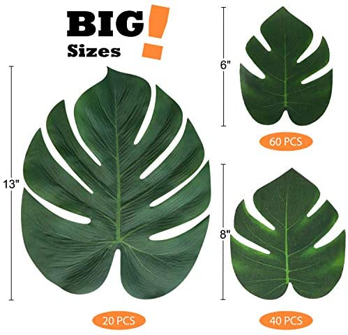 Quantity&Measurement–120pcs included.Tropical lmitation plant leaves are in 3 sizes.Leaves large size:14* 11.3.Medium size:8*6.9.Small size:6*4.6 It looks like the real leaves.Make your guests feel like theyre in paradise with these realistic leaves. Light weight! It was easy to tape them up or stick some onto the walls! Use as a table scatter all over the an event venue, beach party, jungle party, Hawaiian luau theme party and birthday party,etc. Match with other tropical plants, or hibiscus flowers and Hawaiian leis to create a effective stunning tropical party decor.