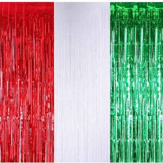 MORANTI 3 ft x 8 ft Metal Foil Tassel Curtain Party Background Suitable for Christmas Party Decoration, 3 Pack (Red, Green, White)