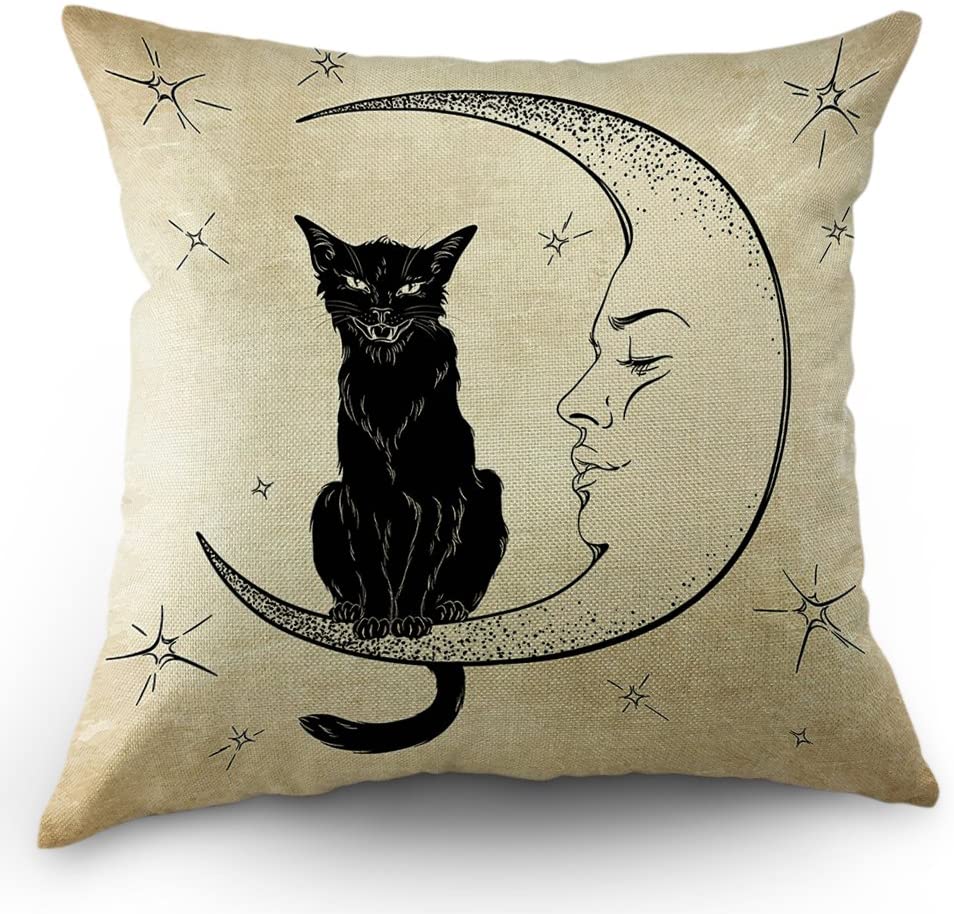 Moslion Cats Moon Throw Pillow Cover Pillow Case Black Cat Sits on The Moon Face Star Cotton Linen Pillow Case 18 x 18 Inch Cushion Cover for Sofa Living Room Light Brown