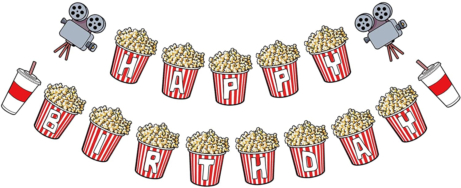Movie Night Theme Happy Birthday Banner, Popcorn Inspired Birthday Party Sign, Watching Movie Bday Pennant Decor