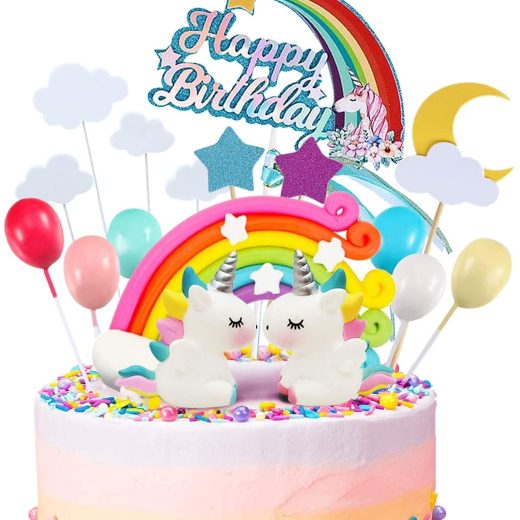 Unicorn Happy birthday Cake Toppers Including: 2*Unicorn, 1*Rainbow, 6*balloons, 8*cloud, 1*moon, 2*stars, 1*Happy Birthday flag, 2*support stick. Fits best on 6inch-10inch cakes. Rainbow Unicorn Cake Decor: Made from high quality resin, striking color, non toxic, safety and not edible , suitable for kids to use. washable and reusable. Rainbow Unicorn: DIY a cute and sparkly Unicorn Cake or a Rainbow Cake. create a fun and entertaining atmosphere for children to make your birthday extra magical Unicorn Party Bags: Unicorn is the perfect accessories birthdays for any age! Whether youre throwing a birthday party or pepping up a sleepover, adding our colourful unicorn topper will make it the coolest party around. Unicorn Cake Decoration: Suit for many situations such as birthday party, wedding, unicorn party and rainbow themed party, garden party, baby showers, home decoration, kids girls birthday candy bar, cake decor, ice cream cake ornaments, weddings, baby shower, anniversaries, tea party etc.