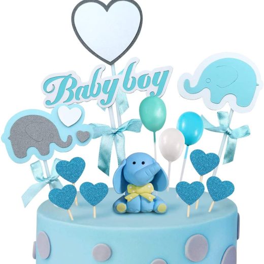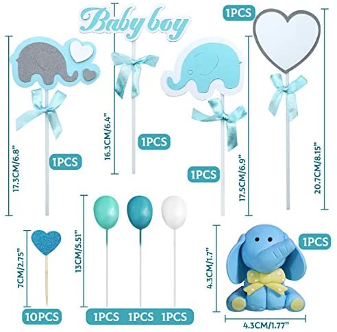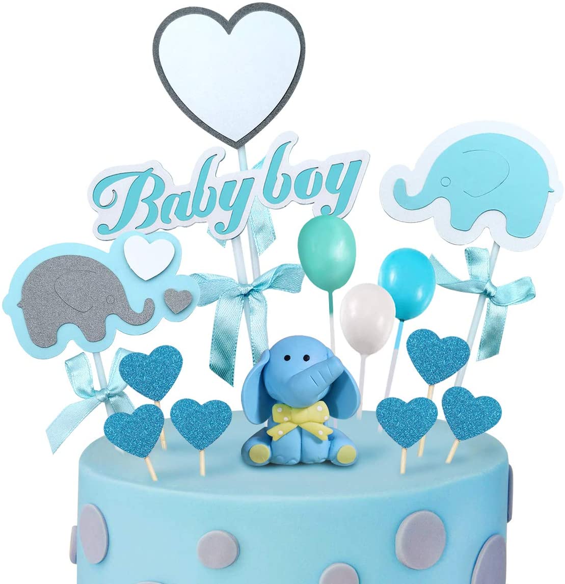 MOVINPE Blue Baby Elephant Cake Toppers Including: 1* Blue elephant Clay Topper1* Blue elephant with blue bow1* Grey elephant with blue bow1* White heart with blue bow1* Blue Baby Boy with blue bow1* Blue Baby Boy with blue bow3* balloon(white, cyan-blue,blue)10* shining blue heartFits best on 6inch-10inch cakes.