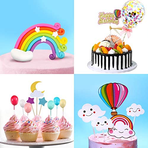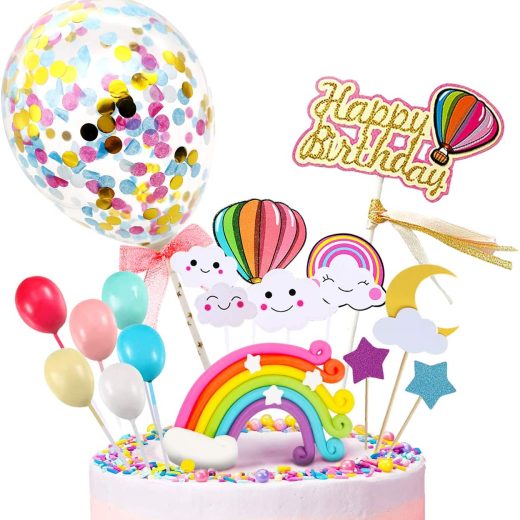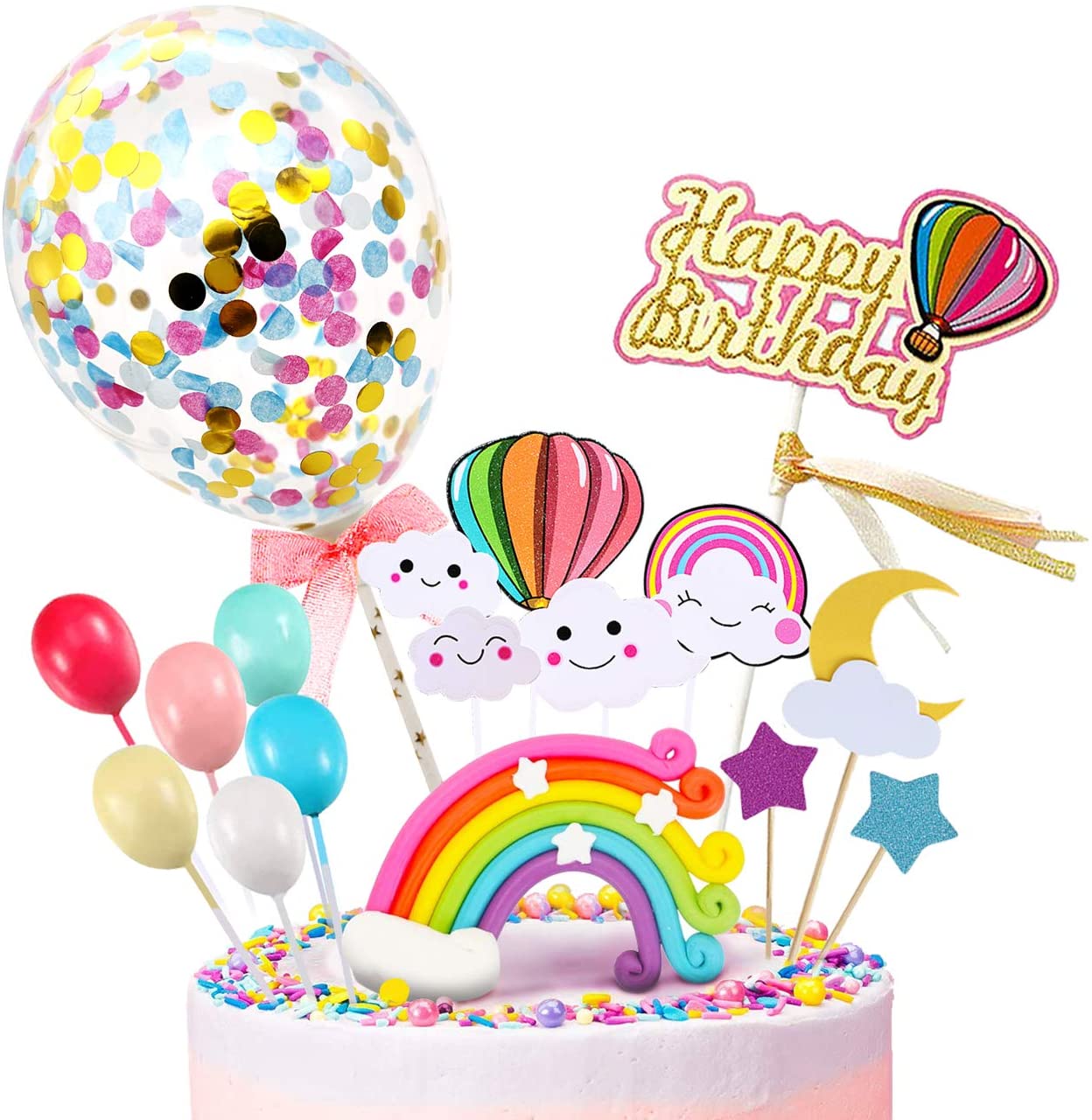 iZoel Confetti Balloons Happy birthday Cake Toppers Including: 1*Confetti balloons1*Rainbow1* happy birthday toppers1*moon2* star6* balloons4* clouds1*fire balloon2 *bottom support stickFits best on 6inch-10inch cakes.