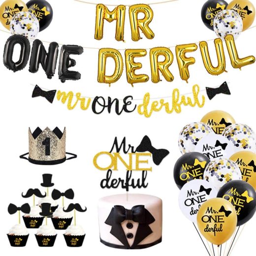 APPLICATION – Mr. onederful 1st birthday party supplies are perfect to decorate little man/wonderful one/bow tie/moustache/top hat 1st birthday boy baby shower party. One year old is the age of innocence and carefree, we hope that you enjoy this special day with your baby, leave this wonderful moment as a permanent memory. SIZE – 1 set Mr onederful balloons size is 16, 1 set Mr onederful banner size is approx 50(the rope is 1.2 feet), 1 pc birthday crown size is 2.8×3, 1 pc Mr.onederful cake topper size: 6.8W x 4.8L, 5 pcs top hat cupcake topper size is 1.2×4.3, 5 pcs moustache cupcake topper size is 3×4.3, 5 pcs bow tie cupcake topper size is 2×5.5. 20 pcs latex balloon size is 12 ( 5 pcs black & 5 pcs gold & 5 pcs white & 5 pcs semi-transparent with gold confetti). EASY-ASSEMBLED – Mr. onederful 1st birthday party supplies are easy to assemble. You can hang the banner on the wall, fireplace, dessert table, or as a backdrop when you take photos. WARM TIPS – Please be careful when inflating the balloons, all the balloons are AIR FILL ONLY and WILL NOT FLOAT even if you try to add helium. Do not over-inflate to prevent pop, 80%-90% is enough. GUARANTEE – Please contact us if there were any problems with the product or service, we will compensate it for the first time, and any of your suggestions are precious and welcome.