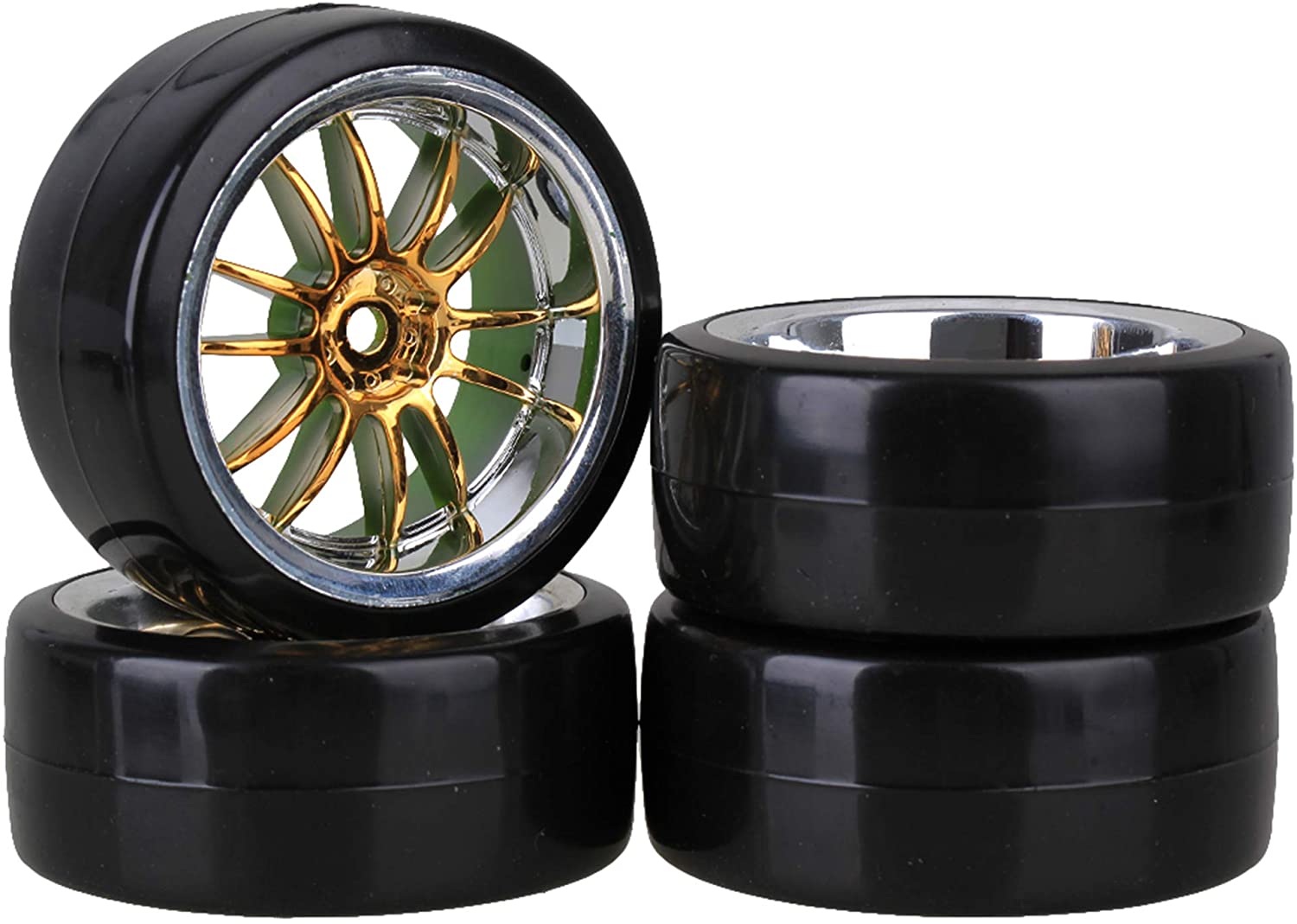 Mxfans 4PCS RC1/10 On Road Car Drift Smooth Wheel Tires & Plastic Plating Golden 12-Spoke Wheel Rims