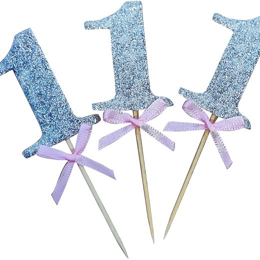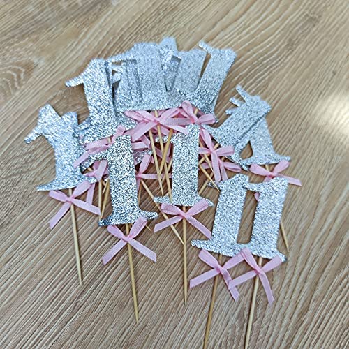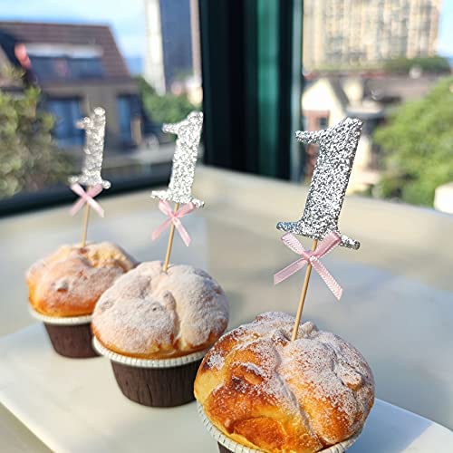 Mybbshower Glitter Silver One Cupcake Toppers for Girls Boys First Birthday Newborn Baby Shower Dessert Table Decoration Pack of 24