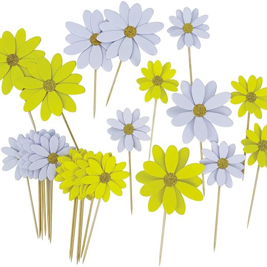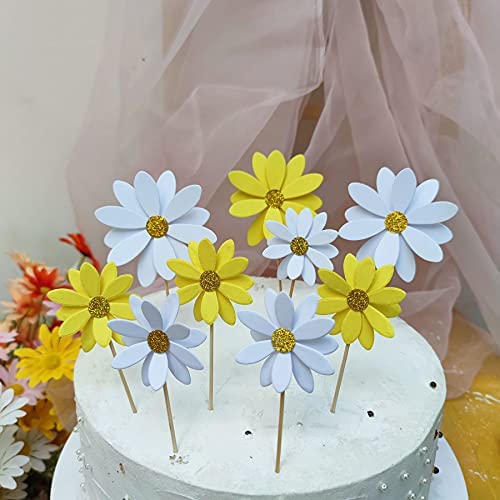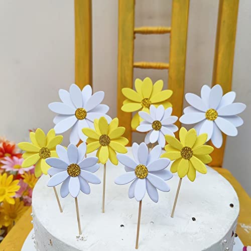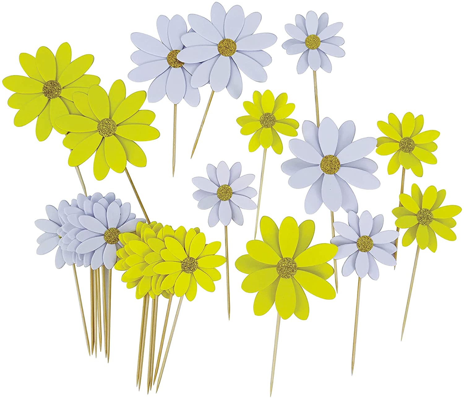 Mybbshower White Yellow Daisy Party Picks Cupcake Toppers Flower Food Picks for Flower Party Birthday Newborn Baby Shower Dessert Table Decoration Pack of 24